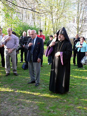 At around 6:00pm the delegation returned to the Temple of Peace, Cardiff, where a group of Church dignitaries and government officials were gathered with members of the Armenain community for a requiem service in memory of the martyrs. Present around the Khachkar in the front yard of the Temple of Peace were, Canon Patrick Thomas, Vicar of St Peter’s Church, Carmarthen; Rev Dafydd Henri Edwards, the Baptist Union of Wales, Revd Dr Trystan Owain Hughes, Chaplain, Cardiff University; Stephen Thomas, Director of the Welsh Centre for International Affairs; Jenny Randerson, Assembly Member; Councillor Mohammed Sarul. The Primate greeted the crowd and invited them to join him in the traditional Hokehangist service, in memory of the martyrs.