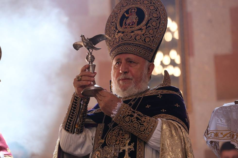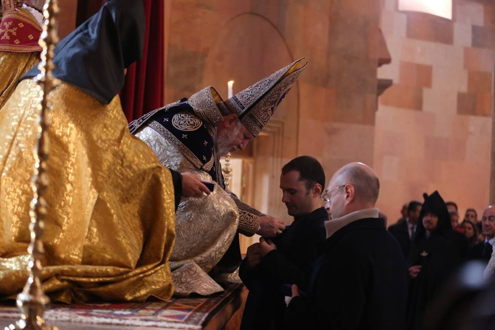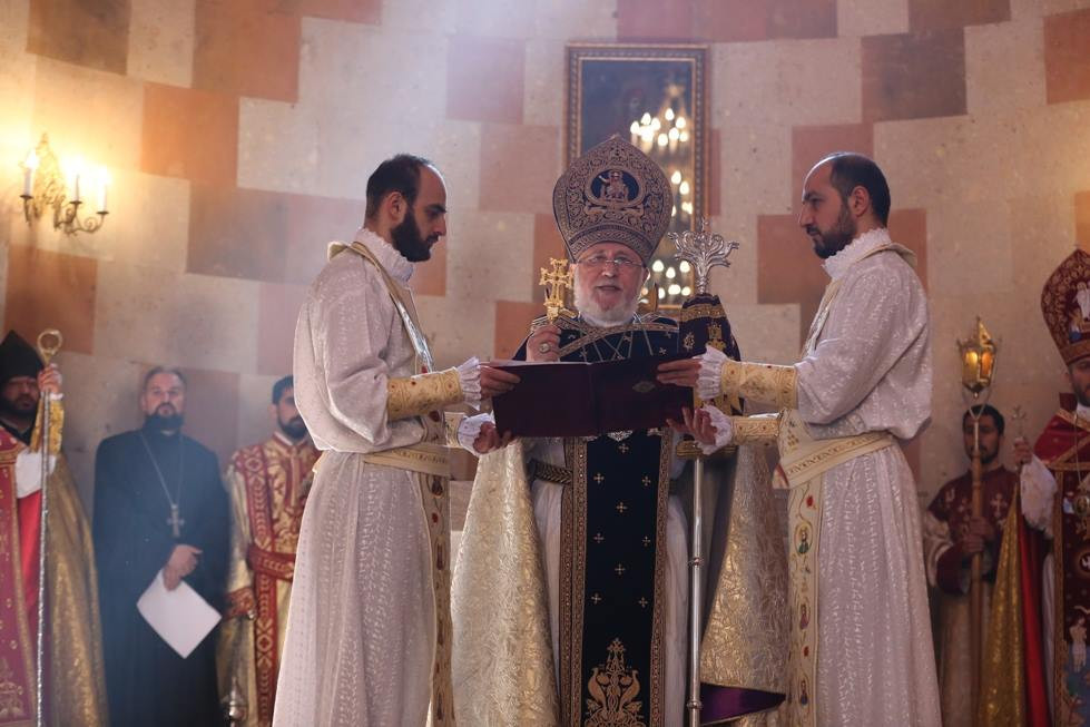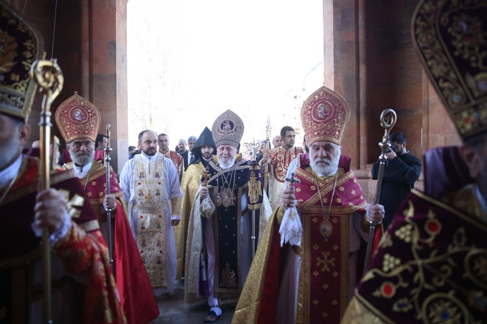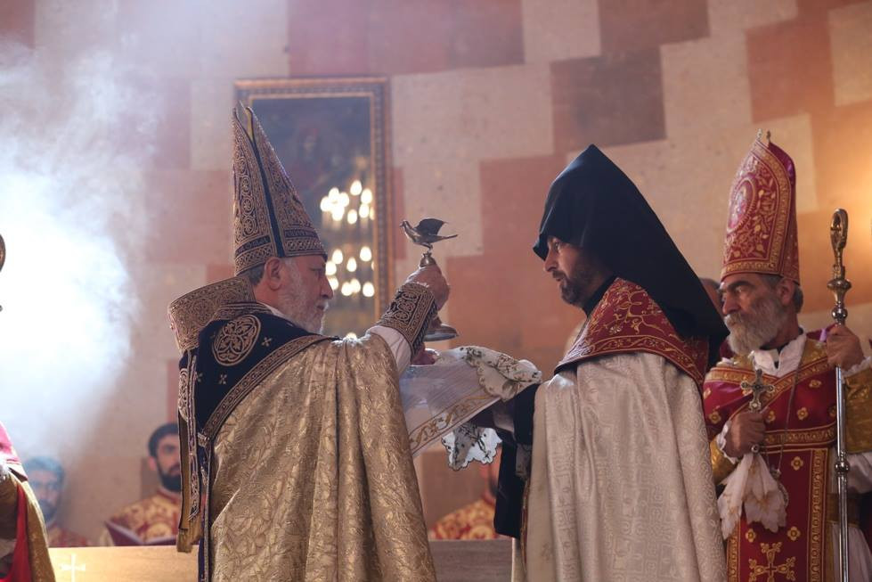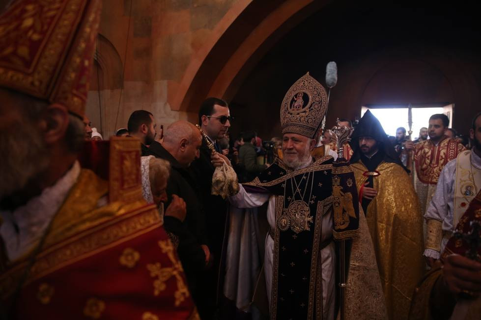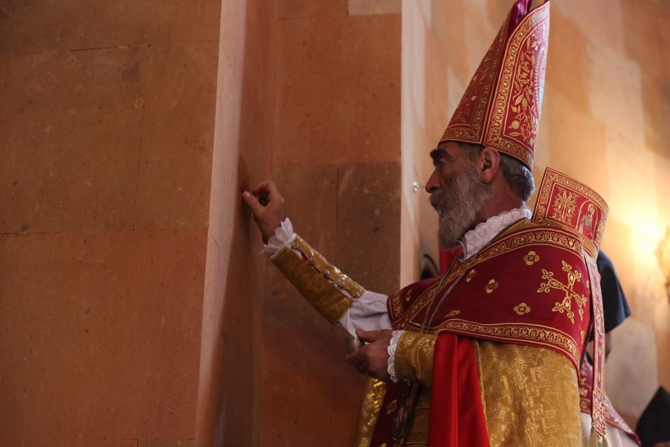 During the Divine Liturgy, under the singing of psalms, the clergy washed the Holy Altar of the Cathedral and the pillars with wine and water. The Catholicos of All Armenians consecrated the Holy Altar of the Cathedral with Holy Chrism. His Eminence Archbishop Pargev Martirosyan, Primate of the Diocese; His Eminence Archbishop Nathan Hovhannisyan, Director of the External Relations and Protocol Department of the Mother See; His Eminence Archbishop Sepuh Chuljyan, Primate of the Diocese of Gougark; His Eminence Archbishop Michael Ajapahyan,