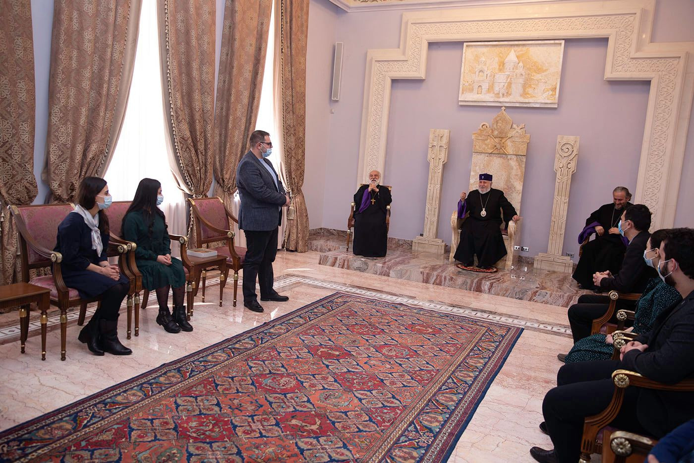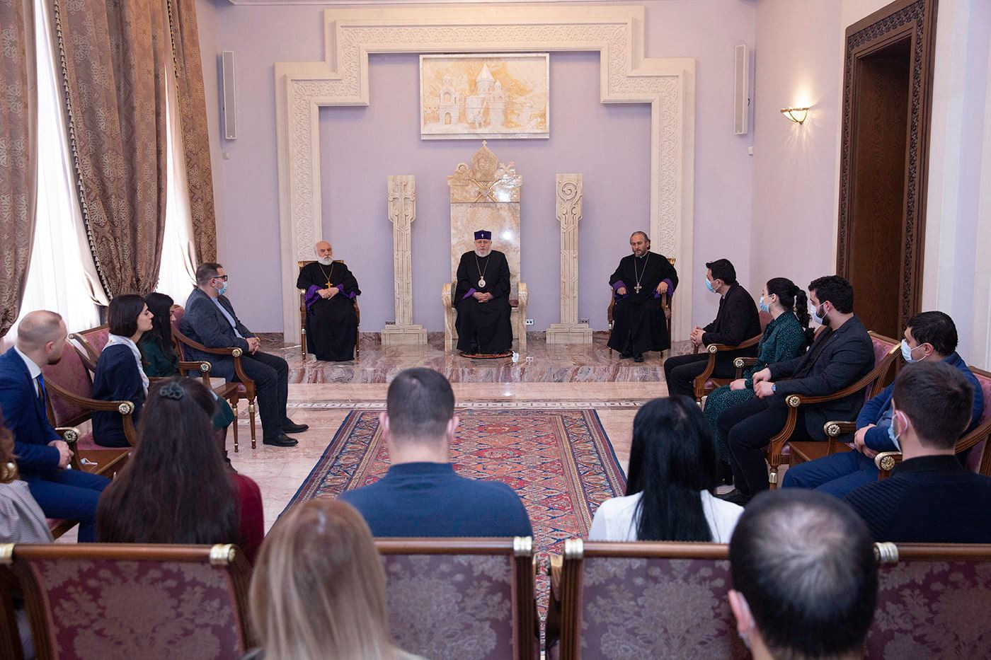 On February 28, in the Mother See of Holy Etchmiadzin, His Holiness Karekin II, Supreme Patriarch and Catholicos of All Armenians; met with the students of different faculties of the Yerevan State University. They were accompanied by the Board of Trustees at YSU, Candidate of History, Associate Professor Mikayel Malkhasyan. First of all, Mr. Malkhasyan, welcoming His Holiness with filial humility, informed that the attendees are the members of the “YSU Supports the Families of the Victims” Initiative of the Yerevan State University. Co-author of the initiative Mr. Eduard Galstyan also delivered a speech. He noted that the initiative is aimed at supporting and strengthening the families who lost their children and relatives because of the war. He expressed hope that the Church, faithful to its mission, makes its irreplaceable contribution to this case. Then, the Catholicos of All Armenians welcomed the initiative of the young students; conveying His Pontifical appreciation and Blessings. The Armenian Pontiff considered the initiative of those present natural and important, emphasizing that it is the duty and responsibility of everyone to support those families in this difficult time. Speaking about the losses of the second war of Artsakh, His Holiness noted, that the memory of our martyrs should be a source of inspiration for us to live, to forge and fill with new hope for the future. The Pontiff of All Armenians reflected on the "Artsakh Outreach" program of the Mother See of Holy Echmiadzin and its goals, as well as, the support of the dioceses and Armenian benefactors all over the world, for the implementation of that program. Referring to the activities of the Church during the war and in the post-war days, His Holiness informed, that both spiritual care and social assistance programs have been implemented: the Mother See of Holy Etchmiadzin tried its best to resolve the the residential issues of displaced families from Artsakh. The Armenian Patriarch spoke with the young people about the importance of the spiritual care of the families of the wounded, the martyred, the captives and the missing ones. In this regard, it was informed, that taking into account the subtlety of the problem; special training courses were organized for the clergy with the involvement of relevant specialists. The Armenian Patriarch informed, that it is planned to establish rehabilitation centers near the Mother See and the monasteries in the future. At the conclusion, the participants addressed their questions to the Catholicos of All Armenians.