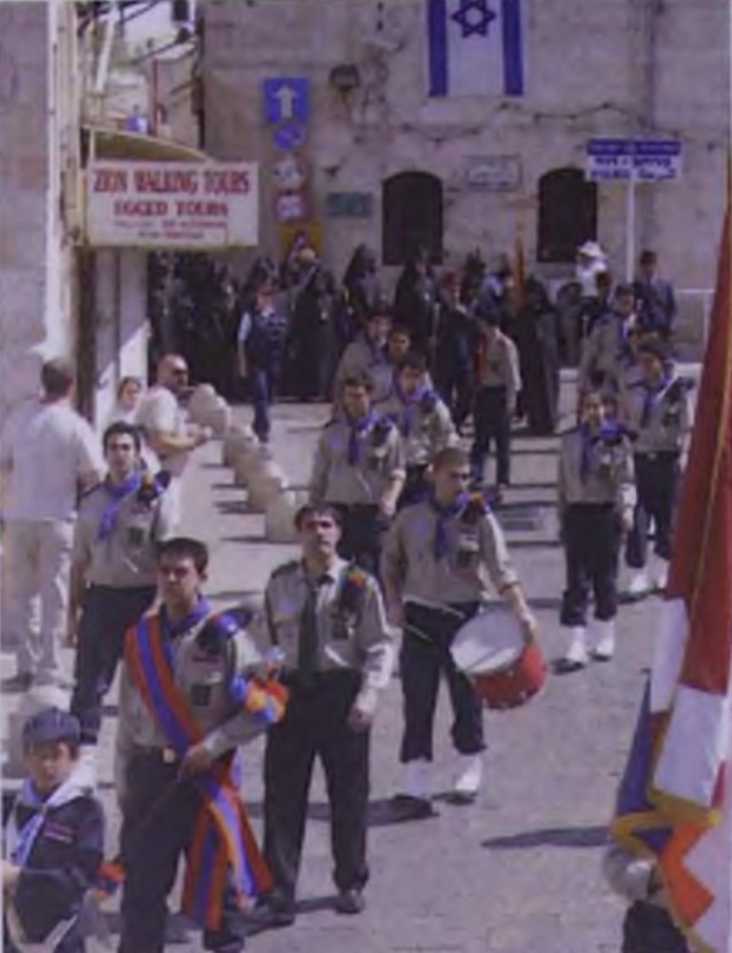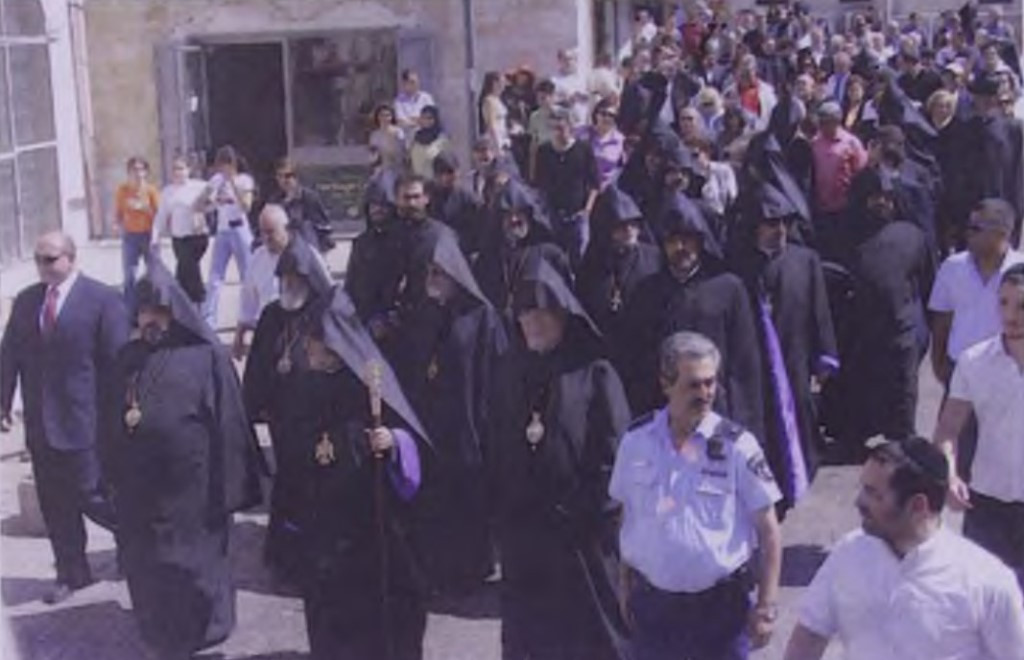 The first stop of the Pontifical Pilgrimage was Jerusalem. On May 12, a procession with the pilgrims and Armenians of Jerusalem traveled to the Armenian Patriarchate of Jerusalem. Led by the Supreme Patriarch and under the singing of "Hrashapar" they entered the St. James Mother Cathedral. At the end of the ceremony a reception was held in the Patriarchal headquarters, during which His Beatitude Archbishop Torgom Manoukian Armenian Patriarch of Jerusalem delivered his welcoming message after which the Catholicos of All Armenians expressed his appreciation.