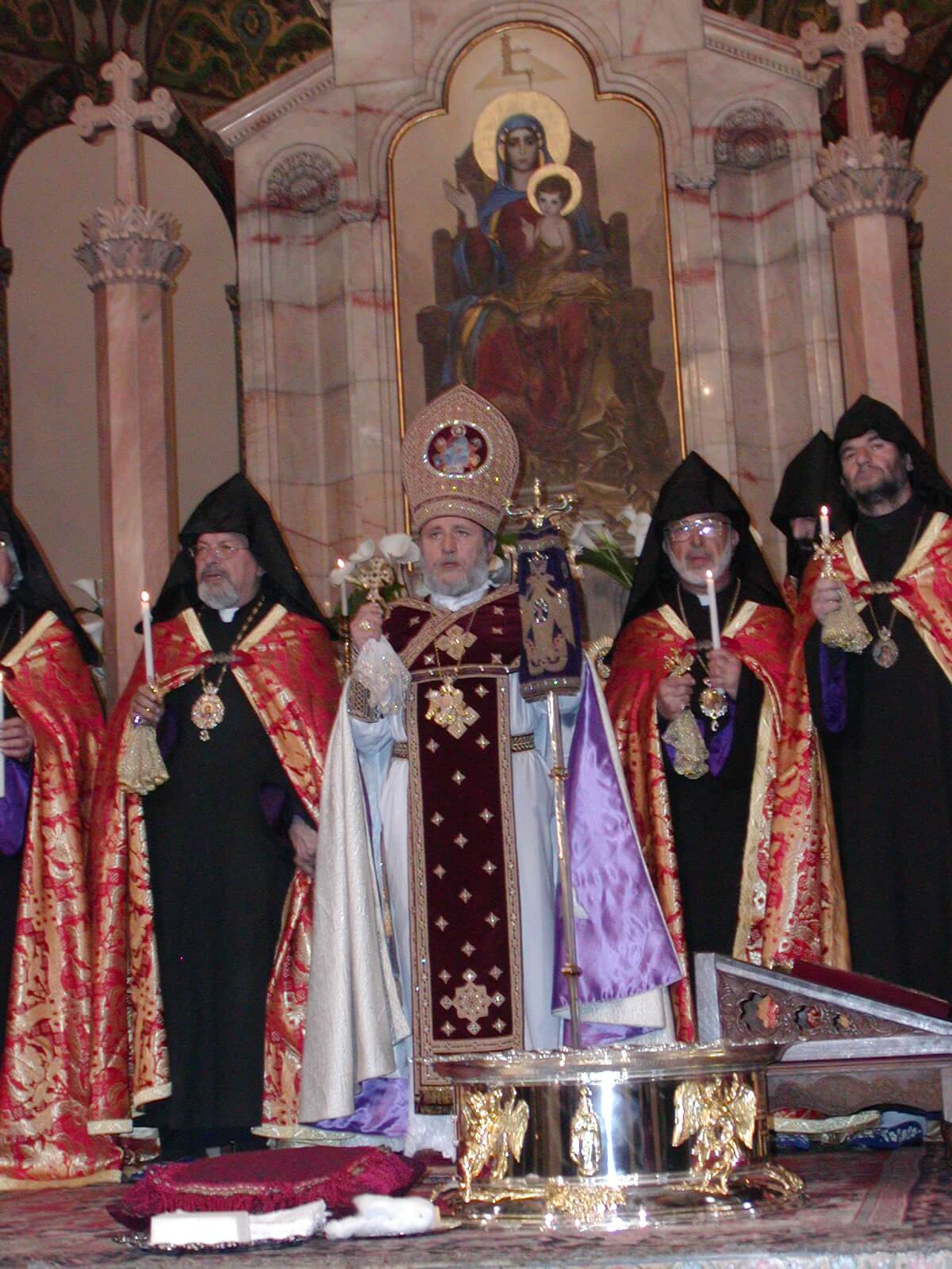 In the early evening, His Holiness Karekin II, Supreme Patriarch and Catholicos of All Armenians presided and conducted the Washing of the Feet Service. Following readings from the Holy Bible, His Holiness blessed the water and oil with the Holy Cross and Gospel. Following the example of Jesus Christ, His Holiness knelt on the bema before the Holy Altar and washed the feet of twelve individuals. This year, in commemoration of the 1,700th Anniversary of the Consecration of the Cathedral of Holy Etchmiadzin, the twelve chosen men were representatives from all ranks of clergy and laity. Two bishops, two celibate priests, two married priests, two deacons, two acolytes and two seminarians each in turn sat before His Holiness, had their feet washed, and kissed his anointed right hand. The final reading from the Gospel once again taught of Christ?s display of true humility and love by this act.