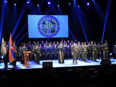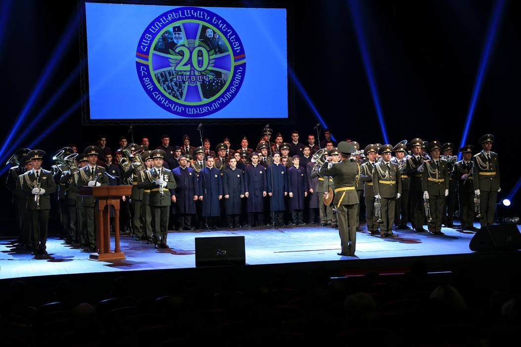 On December 8, a festive event was held dedicated to the 20th anniversary of the founding of the Armenian Church Chaplaincy of the Republic of Armenia Armed Forces. The event was held at the Sundukyan National Academic Theater, under the presidency of His Holiness Karekin II, Supreme Patriarch and Catholicos of All Armenians; and with participation of RA Minister of Defense Mr. Vigen Sargsyan. Prior to the event, guests and participants viewed the "Church-Army" exhibit in the lobby of the theater, where handmade works gifted to the military were on display.