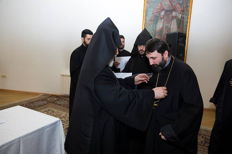 Following opening remarks, the awards ceremony was held. The right to wear the Pectoral Cross was granted to Rev. Fr. Nshan Alaverdyan (Ararat Patriarchal Diocese); Rev. Fr. Matatia Gasparyan (St. Gregory the Illuminator Church, Yerevan); Rev. Fr. Sarkis Sargsyan and Rev. Fr. Tade Takhmazyan (Diocese of Aragatsotn); Rev. Fr. Nerses Arshakyan (Diocese of Vayots Dzor); Rev. Fr. Vahan Heboyan and Rev. Fr. Pargev Zeynalian (Diocese of Syunik); Rev. Fr. Abraham Martirosyan and Rev. Fr. Grigoris Dermenjian (Diocese of Gougark); Rev. Fr. Smbat Abrahamyan and Rev. Fr. Arshavir Asatryan (Diocese of Tavoush); Rev. Fr. Shnorhk Shahinyan and Rev. Fr. Aris Khachatryan (Armed Forces Chaplaincy); Rev. Fr. Vagharsh Isakhanyan (Central European delegation) and Rev. Fr. Karapet Gharibyan (Diocese of Ukraine).