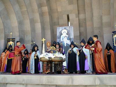 The Feast of the Assumption of the Holy Mother of God was celebrated in the Mother See of Holy Etchmiadzin with great pageantry on Sunday August 17, 2003. Divine Liturgy was celebrated in the Cathedral of Holy Etchmiadzin by His Grace Bishop Paren Avetikian, dedicated to the 1,700th Anniversary of the Consecration of the First Church of the Armenian People. The Universal Cathedral, the design of which St. Gregory the Illuminator saw in a vision illustrated by the Only Begotten Son of God, was consecrated exactly 1,700 years ago on the Feast of the Assumption of the Holy Mother of God. As a result, the Cathedral was dedicated to St. Mary.