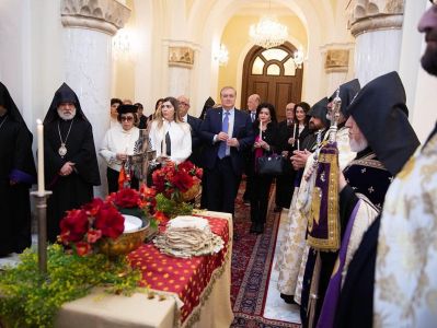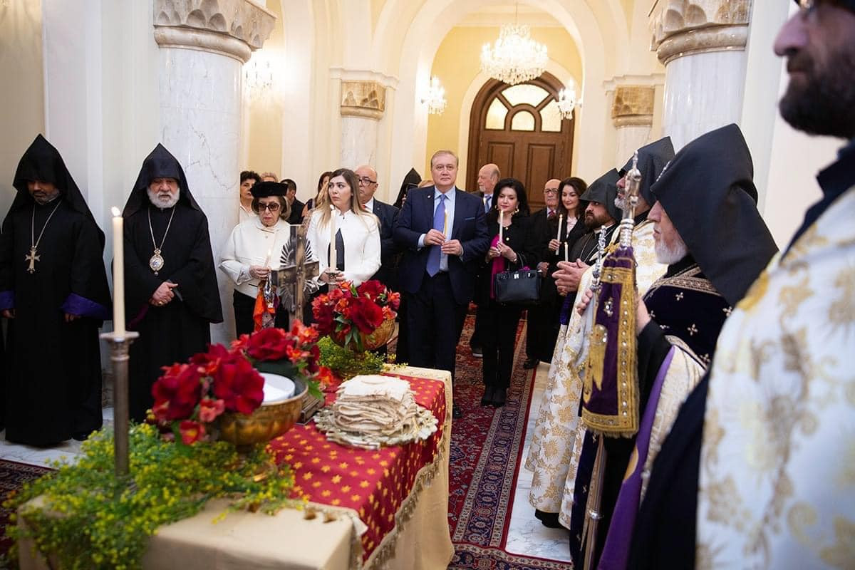 Following the Divine Liturgy, the Brotherhood of the Mother See went to the Pontifical Residence, where, under the presidency of the Pontiff of All Armenians an Easter Home-Blessing Service was offered.