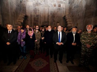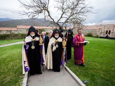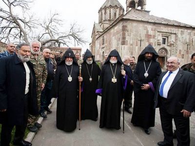 On April 13, His Holiness Karekin II, the Catholicos of All Armenians; and His Holiness Aram I, Catholicos of the Great House of Cilicia; accompanied by His Eminence Archbishop Pargev Srbazan, Primate of the Diocese of Artsakh; and Mr. Ashot Ghulyan, National Assembly Chairman of the Nagorno-Karabakh Republic (NKR); visited the Gandzasar Monastery.