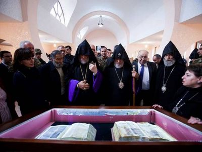 At the conclusion, the Catholicos of All Armenians Karekin II and Catholicos of the Great House of Cilicia Aram I, visited the Mesrop Mashtots Matenadaran, the "Gandzasar" scientific and cultural center, where they were viewed manuscripts created in various workshops of Artsakh, and rare archival documents reflecting the history of Artsakh, particularly Gandzasar, and a collection of antique books.