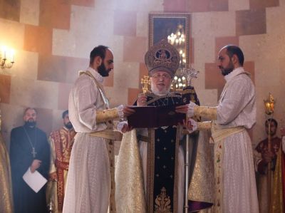 During the Divine Liturgy, under the singing of psalms, the clergy washed the Holy Altar of the Cathedral and the pillars with wine and water. The Catholicos of All Armenians consecrated the Holy Altar of the Cathedral with Holy Chrism. His Eminence Archbishop Pargev Martirosyan, Primate of the Diocese; His Eminence Archbishop Nathan Hovhannisyan, Director of the External Relations and Protocol Department of the Mother See; His Eminence Archbishop Sepuh Chuljyan, Primate of the Diocese of Gougark; His Eminence Archbishop Michael Ajapahyan,