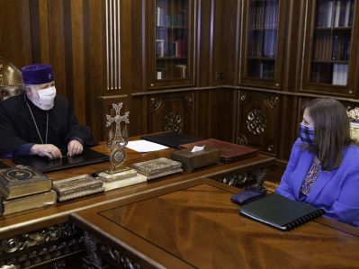 On March 30, in the Mother See of Holy Etchmiadzin, His Holiness Karekin II, Supreme Patriarch and Catholicos of All Armenians; received Mrs. Lynne Tracy, Ambassador Extraordinary and Plenipotentiary of the United States of America to the Republic of Armenia. His Holiness expressed his appreciation to the US authorities for their humanitarian aid to Armenia and the people of Artsakh through the Embassy; in the conditions of the pandemic, and in particular, during the difficult war and post-war period. Reflecting on the military operations unleashed by Azerbaijan against the Republic of Artsakh, and the post-war consequences; His Holiness expressed confidence that the OSCE Minsk Group Co-Chairs will continue their contribution to the establishment of stability in the region and a peaceful and righteous settlement of the Nagorno-Karabakh conflict. During the conversation, a reference was made to the programs implemented by the Armenian Church and their impacts during the pandemic. They spoke about the support provided by the Mother See of Holy Etchmiadzin and the Dioceses during the war, as well as, about the spiritual care of the servicemen and the families displaced from Artsakh. His Holiness provided information on the ongoing social assistance programs, pastoral care of the families of the dead and missing soldiers. The Pontiff of All Armenians and the US Ambassador to RA, particularly touched upon the issue of measures taken by the Armenian Church to release the captives and find the missing. The issues related to the preservation of the spiritual and cultural heritage of Artsakh in the occupied territories; the documented incidents of desecration and destruction of sanctuaries; were discussed in detail.