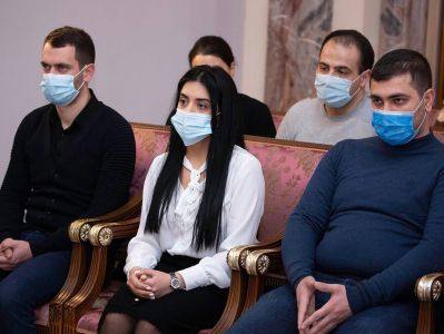 On February 28, in the Mother See of Holy Etchmiadzin, His Holiness Karekin II, Supreme Patriarch and Catholicos of All Armenians; met with the students of different faculties of the Yerevan State University. They were accompanied by the Board of Trustees at YSU, Candidate of History, Associate Professor Mikayel Malkhasyan. First of all, Mr. Malkhasyan, welcoming His Holiness with filial humility, informed that the attendees are the members of the “YSU Supports the Families of the Victims” Initiative of the Yerevan State University. Co-author of the initiative Mr. Eduard Galstyan also delivered a speech. He noted that the initiative is aimed at supporting and strengthening the families who lost their children and relatives because of the war. He expressed hope that the Church, faithful to its mission, makes its irreplaceable contribution to this case. Then, the Catholicos of All Armenians welcomed the initiative of the young students; conveying His Pontifical appreciation and Blessings. The Armenian Pontiff considered the initiative of those present natural and important, emphasizing that it is the duty and responsibility of everyone to support those families in this difficult time. Speaking about the losses of the second war of Artsakh, His Holiness noted, that the memory of our martyrs should be a source of inspiration for us to live, to forge and fill with new hope for the future. The Pontiff of All Armenians reflected on the "Artsakh Outreach" program of the Mother See of Holy Echmiadzin and its goals, as well as, the support of the dioceses and Armenian benefactors all over the world, for the implementation of that program. Referring to the activities of the Church during the war and in the post-war days, His Holiness informed, that both spiritual care and social assistance programs have been implemented: the Mother See of Holy Etchmiadzin tried its best to resolve the the residential issues of displaced families from Artsakh. The Armenian Patriarch spoke with the young people about the importance of the spiritual care of the families of the wounded, the martyred, the captives and the missing ones. In this regard, it was informed, that taking into account the subtlety of the problem; special training courses were organized for the clergy with the involvement of relevant specialists. The Armenian Patriarch informed, that it is planned to establish rehabilitation centers near the Mother See and the monasteries in the future. At the conclusion, the participants addressed their questions to the Catholicos of All Armenians.