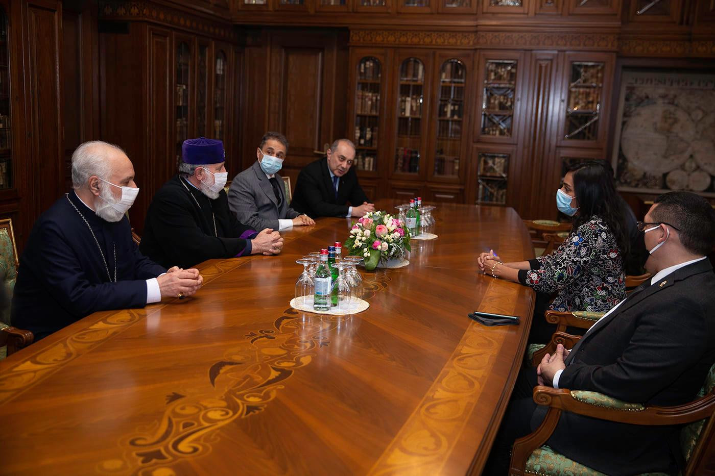 On April 23, in the Mother See of Holy Etchmiadzin, His Holiness Karekin II, Supreme Patriarch and Catholicos of All Armenians; hosted the Delegation led by Mrs. Fanny Carolina Salinas Fernández, President of the Central American Parliament. The Catholicos of All Armenians welcomed the warm relations between the National Assembly of the Republic of Armenia and the Central American Parliament, established in recent years, wishing that the established cooperation will prosper with new achievements due to the memorandum on inter-parliamentary cooperation that will be signed in the coming days. His Holiness importantly noted that the visit of Mrs. Fernández to Armenia takes place on symbolic days, when the Armenian people commemorate the Holy Martyrs of the Armenian Genocide. Speaking about the Genocide committed against the Armenian people a century ago, the Armenian Pontiff noted, that the elimination of such atrocities in the history of mankind is possible only due to the cooperation of all nations. The Catholicos of All Armenians emphasized, that the visit of the Delegation of the Central American Parliament is a proof of that cooperation. The Pontiff of All Armenians also reflected on the second War of Artsakh and the great losses of the Armenian people. His Holiness expressed hope, that the international community will condemn the war crimes committed in front of the eyes of the world. The Patriarch of All Armenians emphasized that the world can develop and prosper by anchoring the human life on law, on the values of justice and truth. In her turn, Mrs. Fernández, expressing joy for the reception, noted that, it is important for her to be in the country which is considered to be the first to adopt Christianity as the state religion in the world. Touching upon to the difficulties of the people of the Central America and condemning atrocities against humanity; Mrs. Fernández emphasized, that due to the developing cooperation, the nations involved in the Central American Parliament, will become a bridge in the process of recognizing the Armenian Genocide.