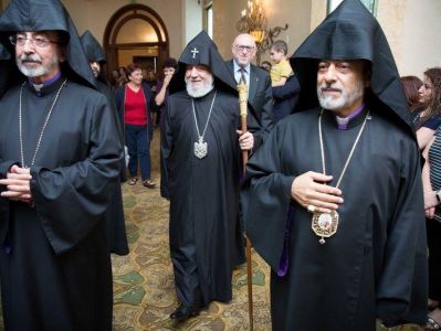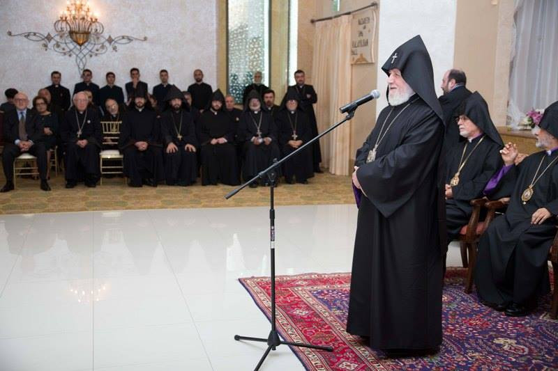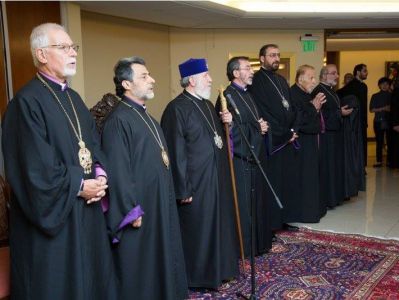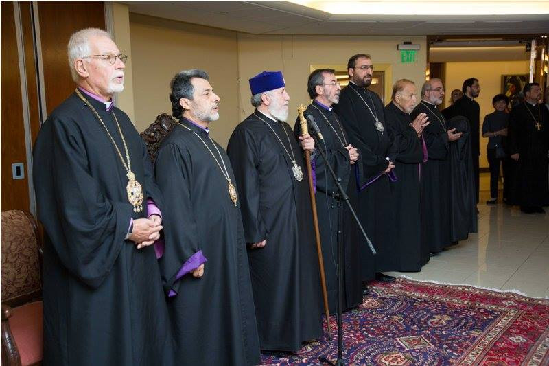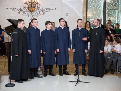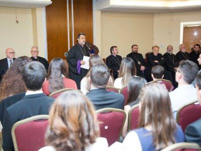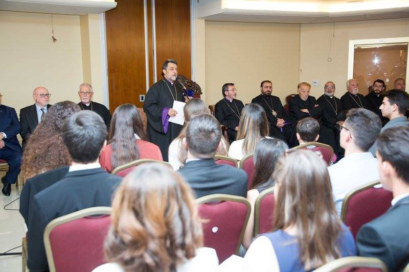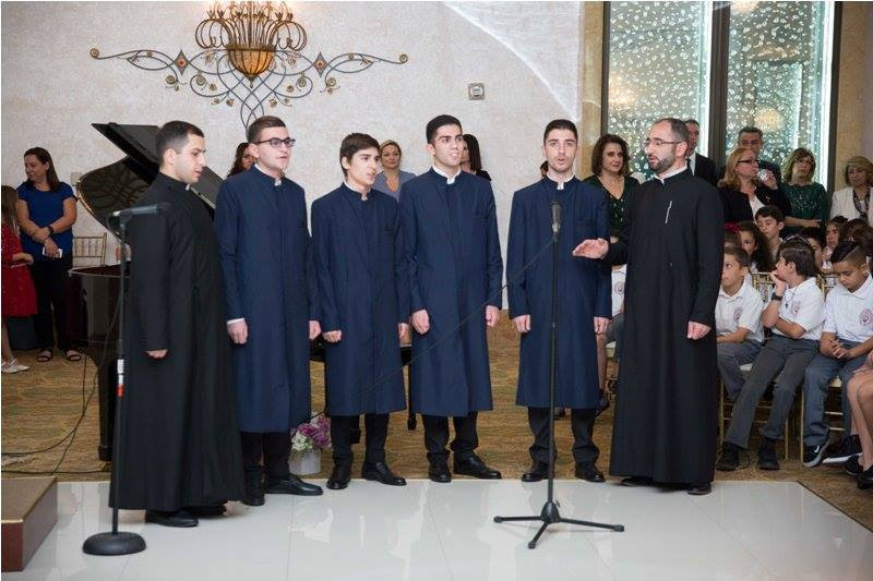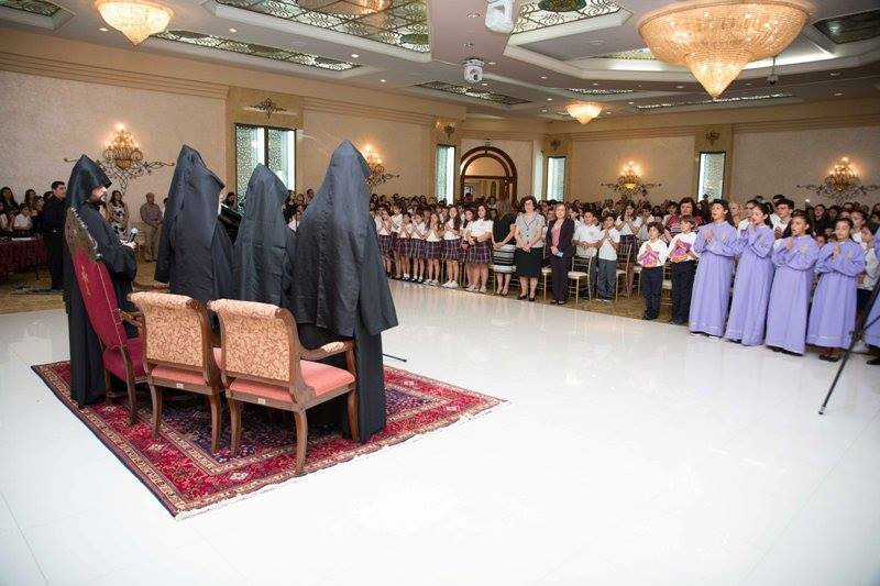 The students of the Gevorkian Theological Seminary, who are alumni of the Harichavank Trbanjian Seminary, also performed. Following the artistic part of the meeting, His Eminence Archbishop Hovnan Derderian, Primate of the Western Diocese of the Armenian Church of North America; gave his remarks, evaluating the mission of the Armenian schools and urging them to keep their love towards the Homeland and Holy Etchmiadzin firm. Then, led by His Eminence, the students jointly recited their covenant to remain faithful to the faith of the church fathers, to love Armenia, remain faithful to Holy Etchmiadzin, and to love and preserve the Armenian language. Then the students sang the Pontifical Prayer.