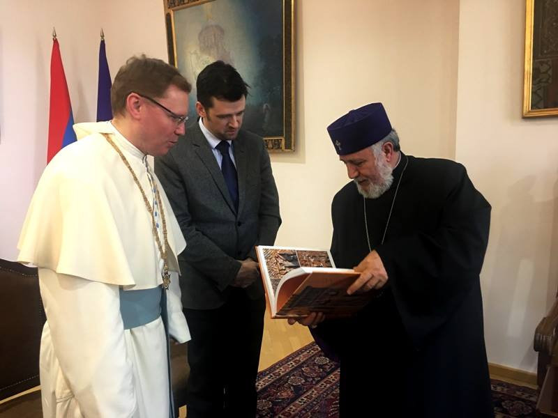 On March 10, His Holiness Karekin II, Supreme Patriarch and Catholicos of All Armenians; received a delegation from the Pazmany Peter Catholic University of Hungary; in the Mother See of Holy Etchmiadzin. They were led by their Rector, Dr. Szuromi Szabolcs, and accompanied by Professor Ruben Mirzakhanyan, Rector of the Yerevan State Pedagogocal University.