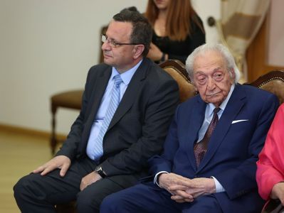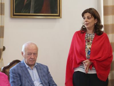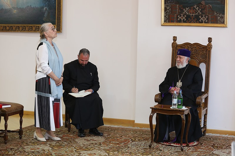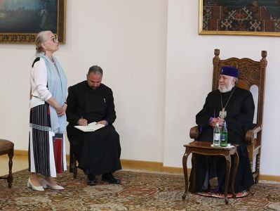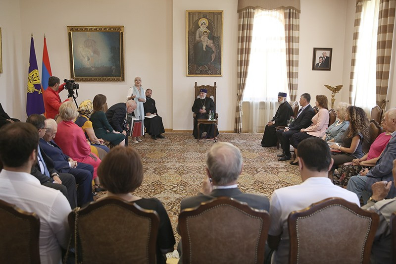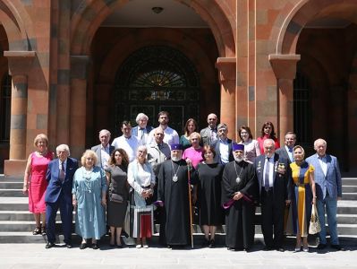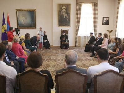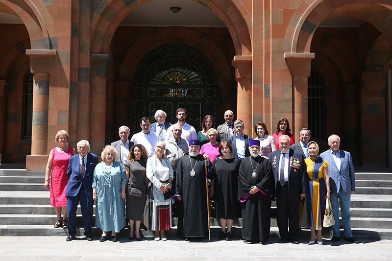 On May 14, in the Mother See of Holy Etchmiadzin, His Holiness Karekin II, Supreme Patriarch and Catholicos of All Armenians; received representatives of Victory Commander's Remembrance Foundation descendants of and World War II commanders. They were accompanied by members of the Union of Armenians of Russia. Mrs. Lusik Ghukasyan, first Vice-President of the Union of Armenians of Russia and Chairman of the Victory Commander’s Foundation Mrs. Natalya Koneva, introduced the group members to the Catholicos of All Armenians, in which were the descendants of Marshal Hovhannes Baghramyan and Marshal Hamazasp Babajanyan. They referred to the the Foundation's mission and its implemented programs. Then, His Holiness Karekin II, conveyed his blessings and appreciation to the Foundation members, welcoming the fund's activities for the glorification of the heroes who created victory. His Holiness noted the importance of all the steps due to which the memory of the heroic victims of the World War II and the warriors will last forever. The Armenian Patriarch emphasized that the memory is sacred and cherished and it should be kept and forwarded to the future generations. His Holiness also touched upon the important role of the Armenian people in the war, as well as the efforts of the Armenian Church in support of the Army, as a result of which the "Sasoun of Davit" tank columns were created. Talking about the centuries-long friendship between the Armenian and Russian people, the Catholicos of All Armenians mentioned that the victory recorded during the World War II further strengthened that brotherhood. His Holiness expressed confidence that such initiatives, as the Fund's initiative should further deepen the existing warm relations. At the conclusion, His Holiness wished that the two people continue to strengthen their relationship with the same spirit.