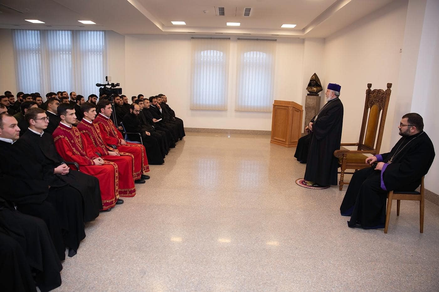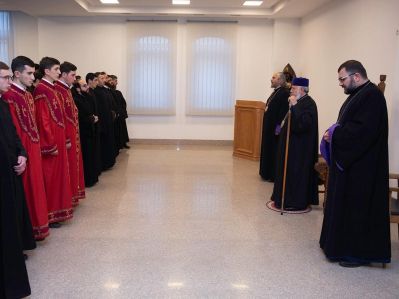 On December 25, His Holiness Karekin II, Supreme Patriarch and Catholicos of All Armenians; received the deacons of the Gevorgian Theological Seminary, deacons serving in the Mother See of Holy Etchmiadzin and the newly ordained deacons on the occasion of the feast of St. Stephen the Proto-Deacon, accompanied by His Grace Bishop Moushegh Babayan, Grand Sacristan of the Mother See of Holy Etchmiadzin; His Grace Bishop Vrtanes Abrahamyan, Primate of the Armenian Diocese of Artsakh has been appointed as Director of the Artsakh spiritual and cultural heritage office; and Proto-Archimandrite Shahe Ananyan, Dean of the Gevorkian Theological Seminary.