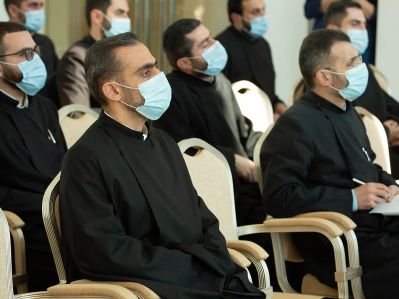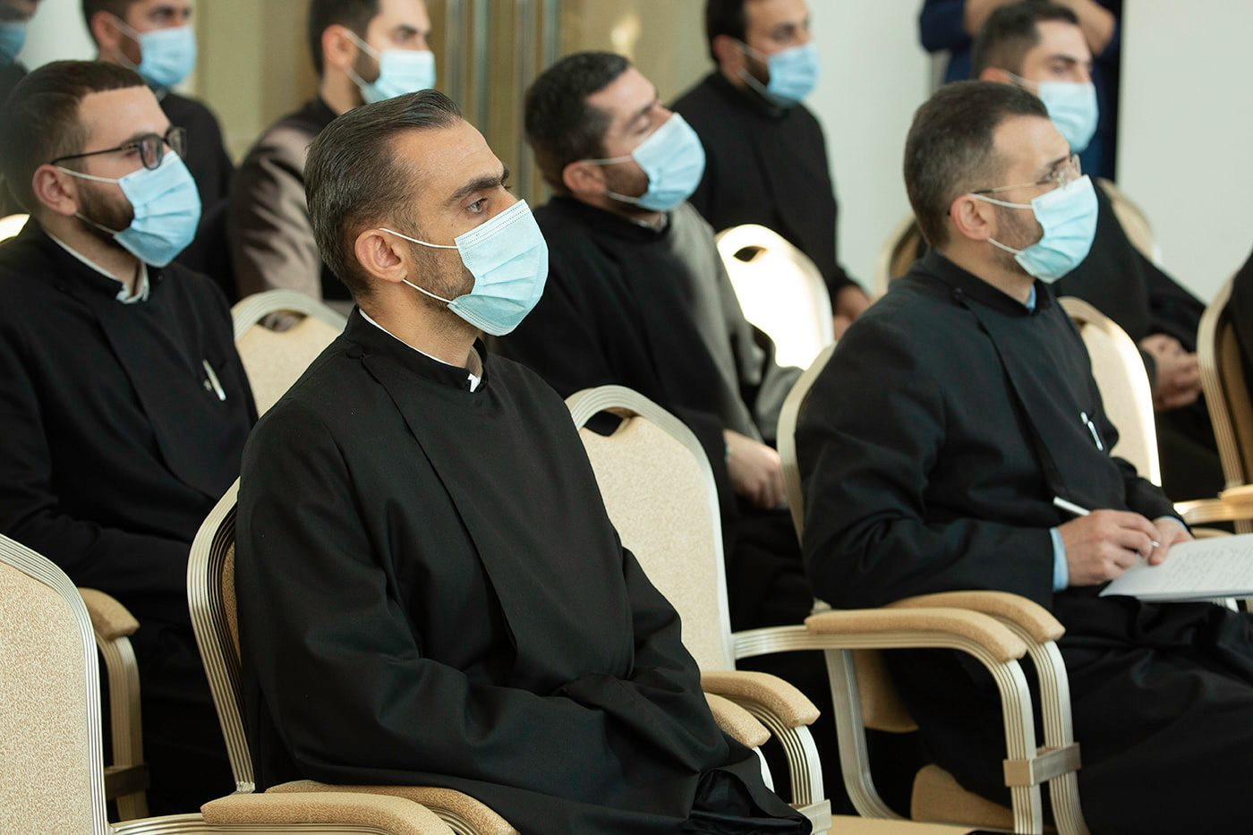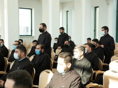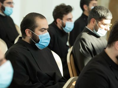 On December 28, His Holiness Karekin II, Supreme Patriarch and Catholicos of All Armenians; received the deacons of the Mother See of Holy Etchmiadzin, on the occasion of the feast of St. Stephen the Proto-Deacon (on December 26 this year). The deacons greeted the Armenian Pontiff singing the hymn “St. Stephen, Sweet Bird”, then, following the Lord’s Prayer, on behalf of the members of the Brotherhood, His Grace Bishop Moushegh Babayan addressed His Holiness, emphasizing that the deacons have gathered to receive the Blessing of the Armenian Patriarch, to listen to His Pontifical advice and exhortations, to continue their service with more zeal in the Armenian churches all over the world. In his speech, His Grace Bishop Moushegh also reflected on the brave service of the chaplains during the Artsakh war, which confirmed the mission of being a devoted and true descendant of St. Stephen the Proto-Deacon. Then, the Pontiff of All Armenians conveyed his Pontifical massage and Blessings to the deacons. His Holiness noted with regret, that this year, the feast of St. Stephen was not celebrated with special solemnity in the Mother See, because of the severe consequences of the war. However, the Armenian Patriarch emphasized the importance of the meeting with the deacons, touching upon the mission of the Armenian Church, the service of the deacons in the Church all over the world, as well as, in the life of the Armenian people, and to continue their spiritual service to the Armenian sons diligently. On this occasion, His Holiness expressed his appreciation to the deacons for their devoted service, in particular, noting their useful service to the Armenian Army, proving what kind of spirit they were inspiring, and conveying courage to the soldiers with their own examples. The Armenian Patriarch noted with gratitude that during both the epidemic conditions and Artsakh war, all the clergy showed high consciousness and spirit of devoted service, fully participating in the defense of the Homeland, having great contribution to the solutions of various problems. Reflecting on the current situation, and the importance of the implementation of the spiritual care in the lives of the Armenian sons, the Pontiff of All Armenians emphasized, that the clergy, including the deacons, have a lot to do to alleviate the pain and loss of the families and individuals who have suffered the most from the consequences of the war and need support. In this regard, His Holiness presented the mission of the Committee formed for the implementation of the "Let's Support Artsakh" social program of the Mother See, noting the importance of the involvement of the deacons in the program. In the conclusion, His Holiness Karekin II, Supreme Patriarch and Catholicos of All Armenians, urged the deacons to continue their patriotic and God-pleasing service with unconditional devotion and zeal, wishing them the help, support and the Blessings of God so that the Armenian Church became prosperous and beloved for the children of the nation due to their service.