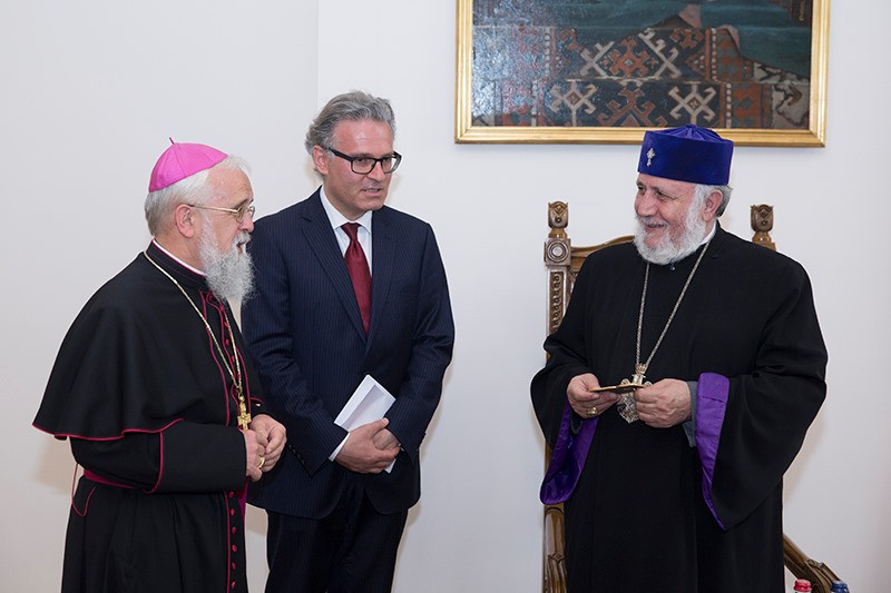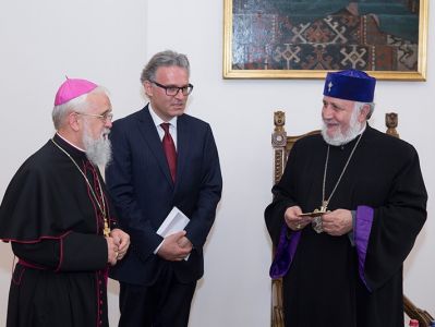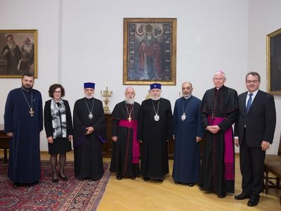 In turn, Bishop Feige conveyed His Holiness the warm greetings and best wishes of Archbishop Reinhard Marx of the Catholic Church and Chairman of the German Bishops' Conference. Bishop Feige highlighted the deepening and development of the relationship between the two Churches in different spheres. He confirmed that the friendly ties between the German Catholic Church and the Armenian Diocese of Germany are continuously strengtheni