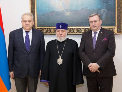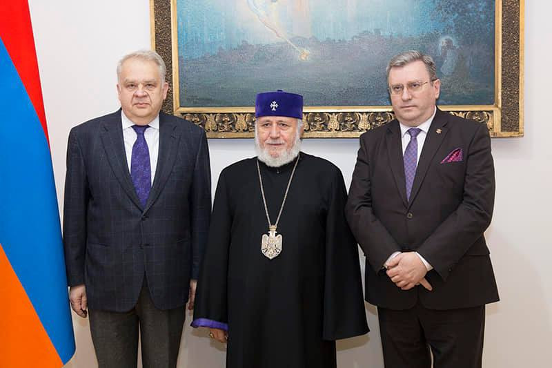 On December 22, in the Mother See of Holy Etchmiadzin, His Holiness Karekin II, Supreme Patriarch and Catholicos of All Armenians; received the delegation of Professor Aleksey Lubkov, President of the Association of Pedagogical Universities of Eurasian Union, rector of the Moscow State Pedagogical University and corresponding member of the Russian Academy of Education. They were accompanied by Dr. Rouben Mirzakhanian, Rector of the Yerevan State Pedagogical University.