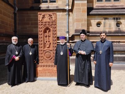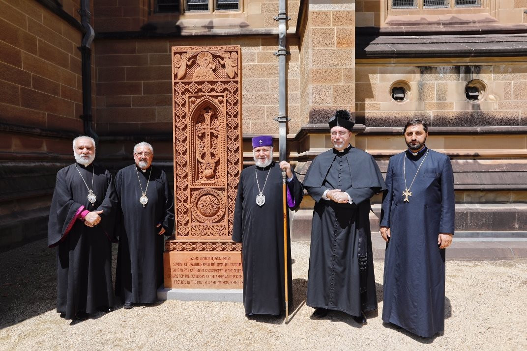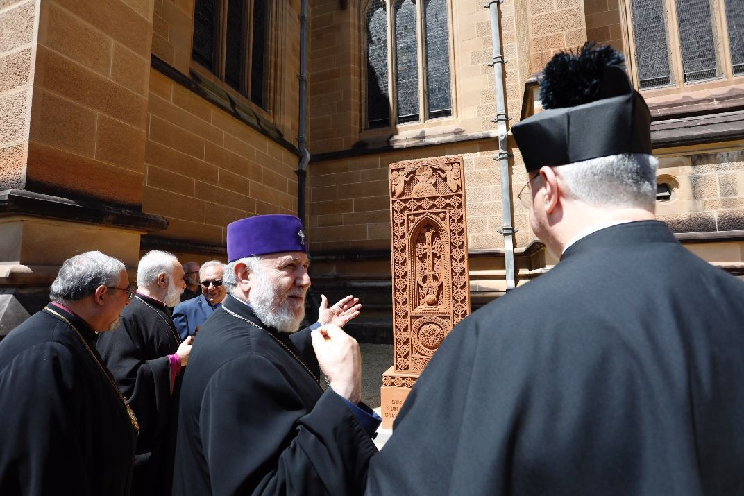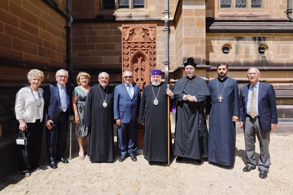 The Pontiff of All Armenians extended a prayer at the entrance of the temple, in front of the Armenian Cross-stone (Khachkar) which was placed by the efforts of Archbishop of Sydney Most Rev Anthony Fisher, the great friend of the Armenians on December 18, 2018 and by the donation of Mr. Stephan and Mrs. Hilda Grkasharians. The Cross-stone is dedicated to the memory of the Armenian Genocide.