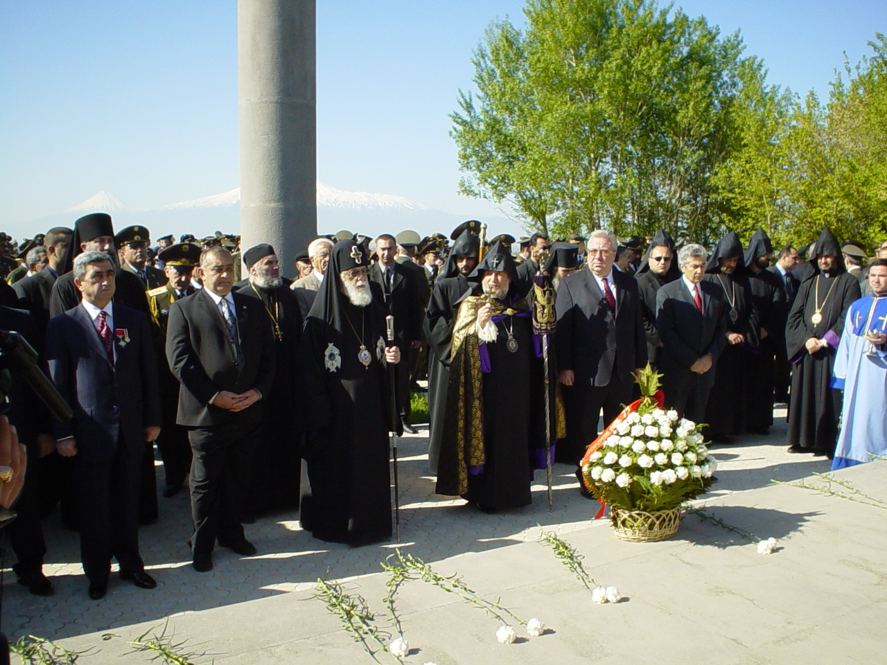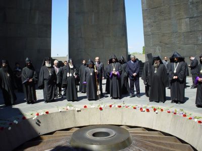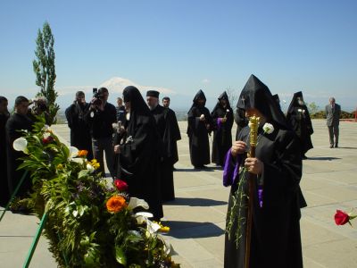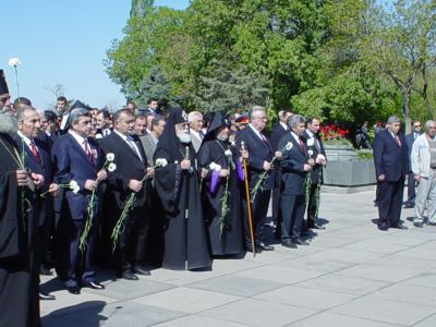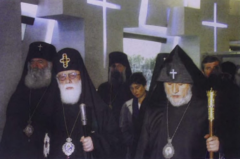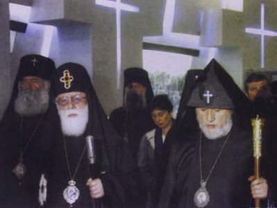 In the afternoon, the two Pontiffs accompanied by delegations from both churches, visited the "Tsitsernakaberd" Memorial to the Armenian Genocide, where they offered prayers for the rest of the souls of the 1.5 million martyrs of the first genocide of the 20th Century. Following a Requiem Service, His Holiness Ilia II planted a tree in memory of the victims on the grounds of the Genocide Museum.