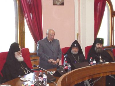 His Holiness Ilia II thanked the Academy President for the warm reception noting that the spirit of fraternity has always existed between the two nations. His Holiness Ilia II mentioned that both Churches have always been sponsors and advocates of science and culture, and that monasteries in both Armenia and Georgia have always been famous scientific-cultural centers. "The difficulties facing the scientists are part of the difficulties presently facing our people. It is our task to support our scientists by all means," said His Holiness Ilia II.