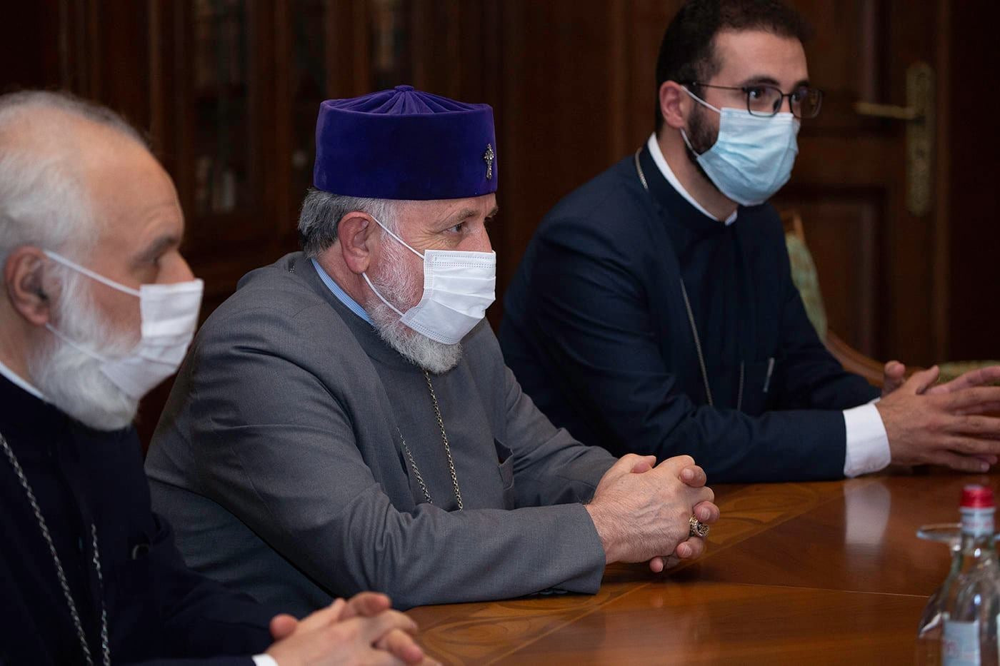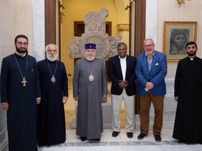On June 15, in the Mother See of Holy Etchmiadzin, His Holiness Karekin II, Supreme Patriarch and Catholicos of All Armenians; hosted Mr. Tovmas Vargenzen and Mr. Michael La Civitan, representatives of the Catholic Near East Welfare Association (CNEWA), accompanied by Rev. Fr. Archimandrite Narek Mnoyan, Assistant to the Primate of the Armenian Holy Church in Eastern Europe, Russia, Georgia and Armenia. At the meeting, Archimandrite Narek presented the guests to the Pontiff of All Armenians, providing information about the activities of their organization. During the conversation, they spoke about the ongoing humanitarian and social assistance provided to the children of the Armenian people who suffered the horrors of the Second War of Artsakh, in parallel with the soul-saving mission of different structures of the Armenian Church. In this regard, the Armenian Patriarch conveyed his appreciation to the representatives of the organization for providing assistance to the Armenian sons suffered from the war. His Holiness also reflected with gratitude to the support of various international structures to Armenia and Artsakh during this difficult period. His Holiness spoke about the current challenges, particularly drawing the attention of the guests to the fact of encroachments on the borders of Armenia, as well as to the brutal attitude towards the Armenian cultural heritage in the territories under the control of Azerbaijan. At the conclusion, the Pontiff of All Armenians answered the questions of those present regarding the efforts being made by the Mother See to return the Armenian captives, to help the wounded soldiers and displaced families.