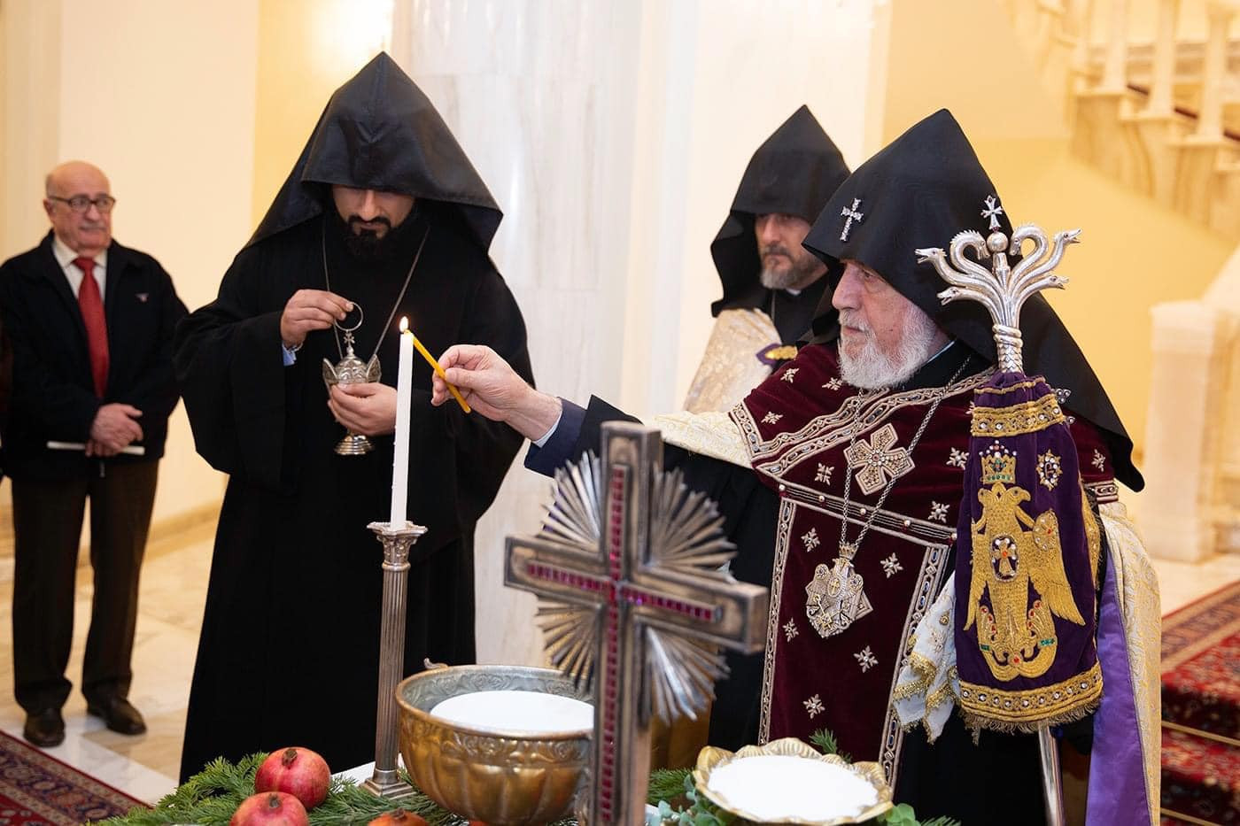 At the conclusion of the Divine Liturgy, His Holiness ascended the Holy Alter and lit a candle, so that the faithful have the opportunity to light their own candles, and take the light to their home symbolizing the light of the revealed Son of God. Then, the Brotherhood of the Mother See gathered in the Pontifical Residence, where under the presidency of His Holiness Karekin II, Supreme Patriarch and Catholicos of All Armenian; a Christmas Home-Blessing Service was offered.