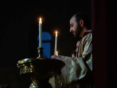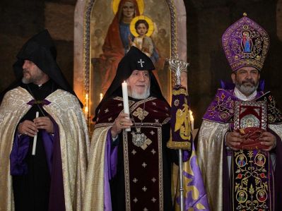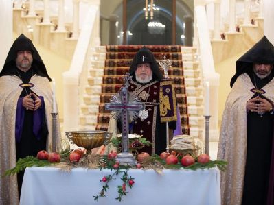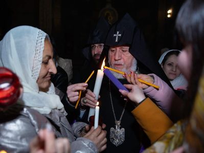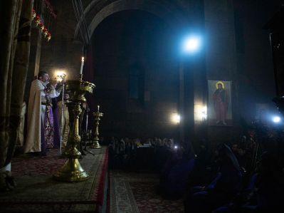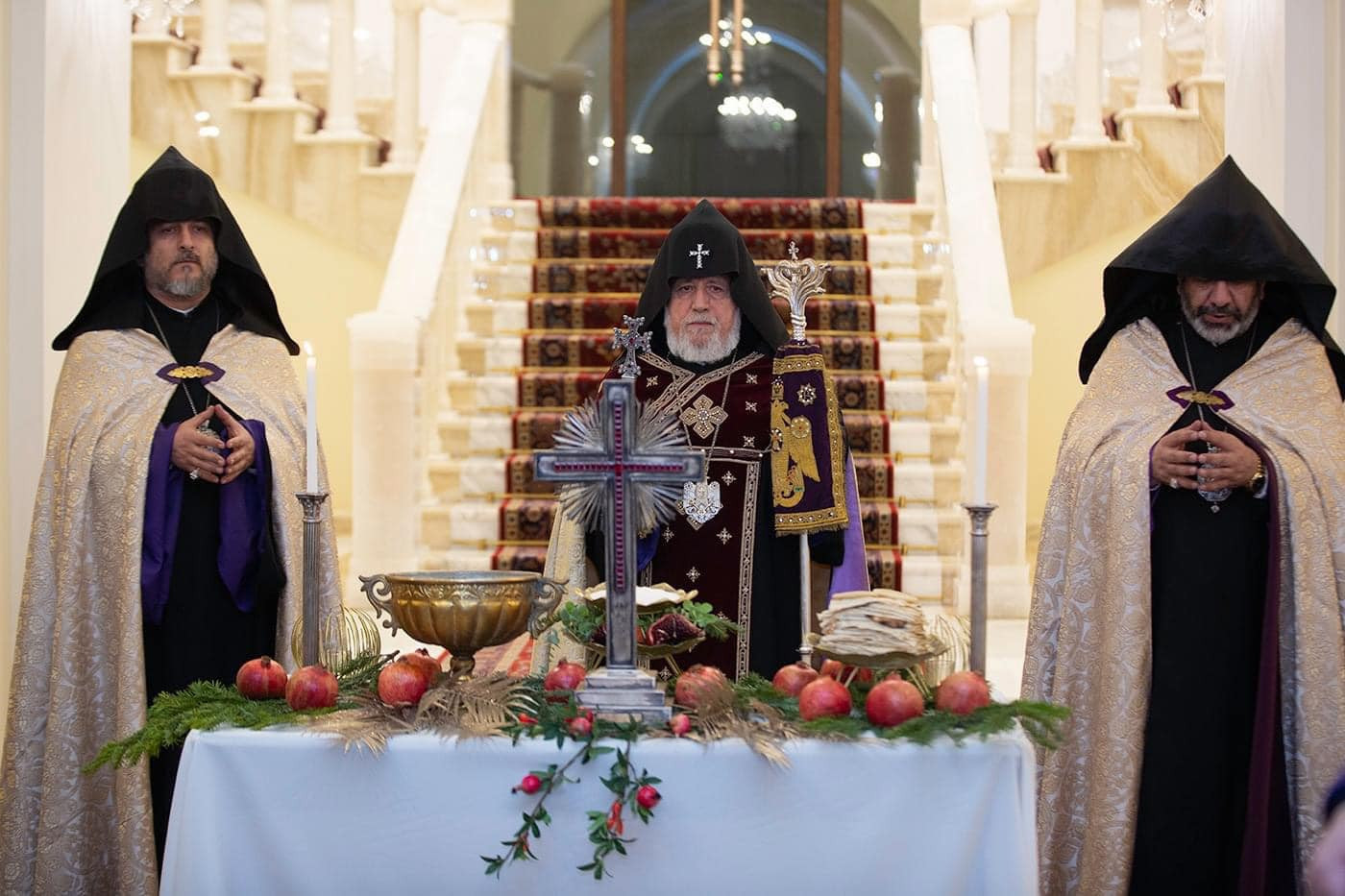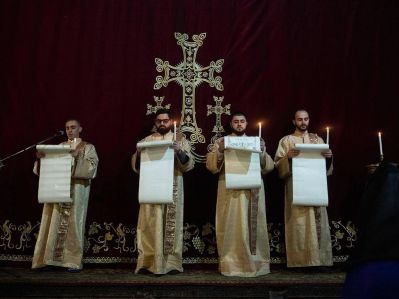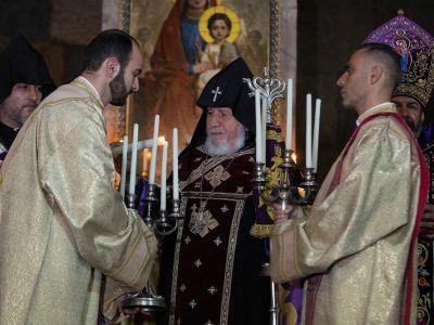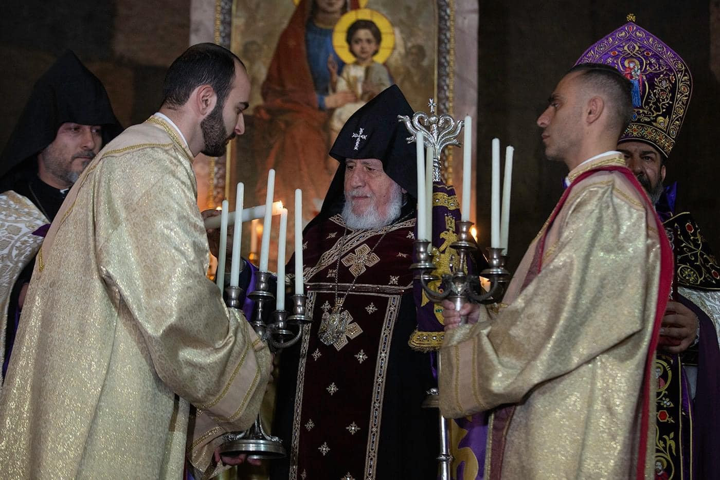 On January 05, on the Eve of the Feats of the Holy Nativity and Theophany of Our Lord Jesus Christ, under the presidency of His Holiness Karekin II, Supreme Patriarch and Catholicos of All Armenians; Candlelight Divine Liturgy was celebrated in the St. Gayane Monastery, which was attended by the members of the Brotherhood of the Mother See of Holy Etchmiadzin and the Armenian faithful. The Celebrant was His Grace Bishop Vasken Mirzakhanyan, Director of the Ecclesiastical Conceptual Issues Office of the Mother See of Holy Etchmiadzin. Prior to the Divine Liturgy, an Evening Service was held and different Bible passages were read, then four Deacons of Mother See read the Prophecy of Daniel.