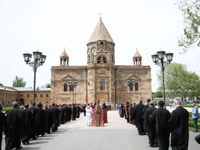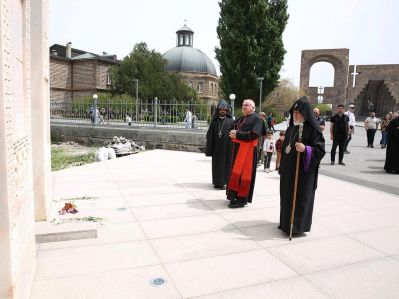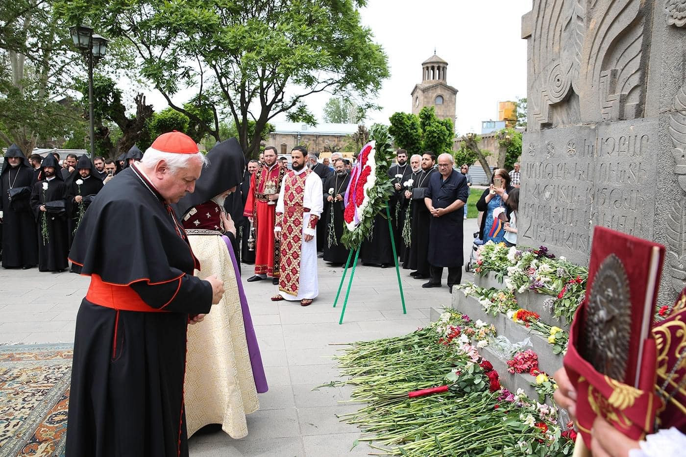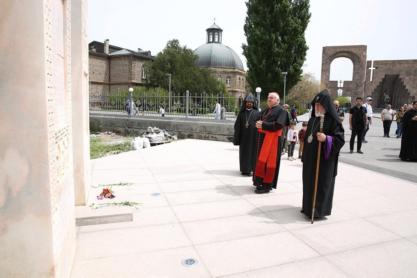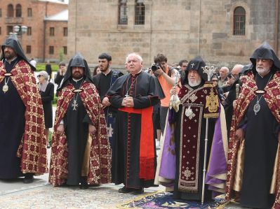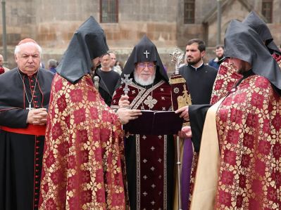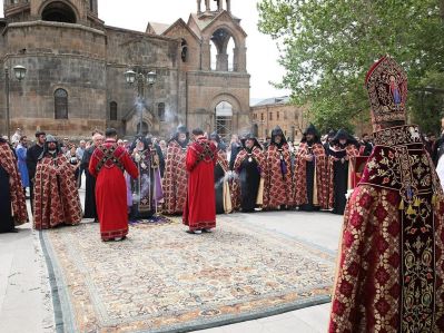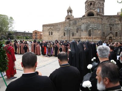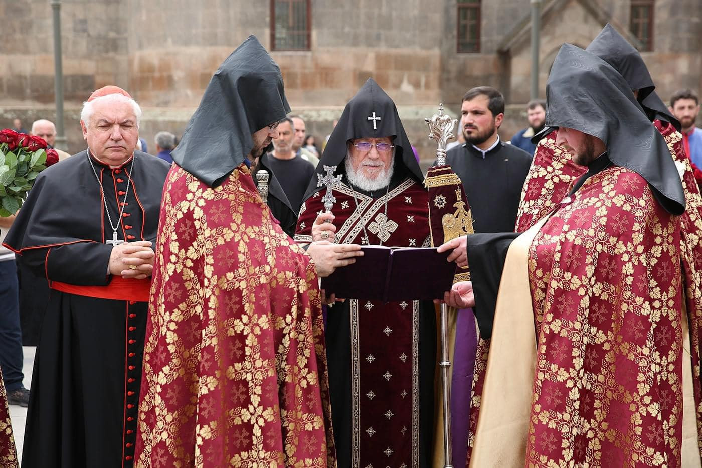 At the end of the Divine Liturgy, the procession of the clergy, carrying the reliquary of the holy martyrs, went to the courtyard of the Mother Cathedral, where in front of the cross-stone of prayer and vow, under the presiding authority of the Catholicos of All Armenians, the intercession order of the holy martyrs of the Armenian Genocide was performed.