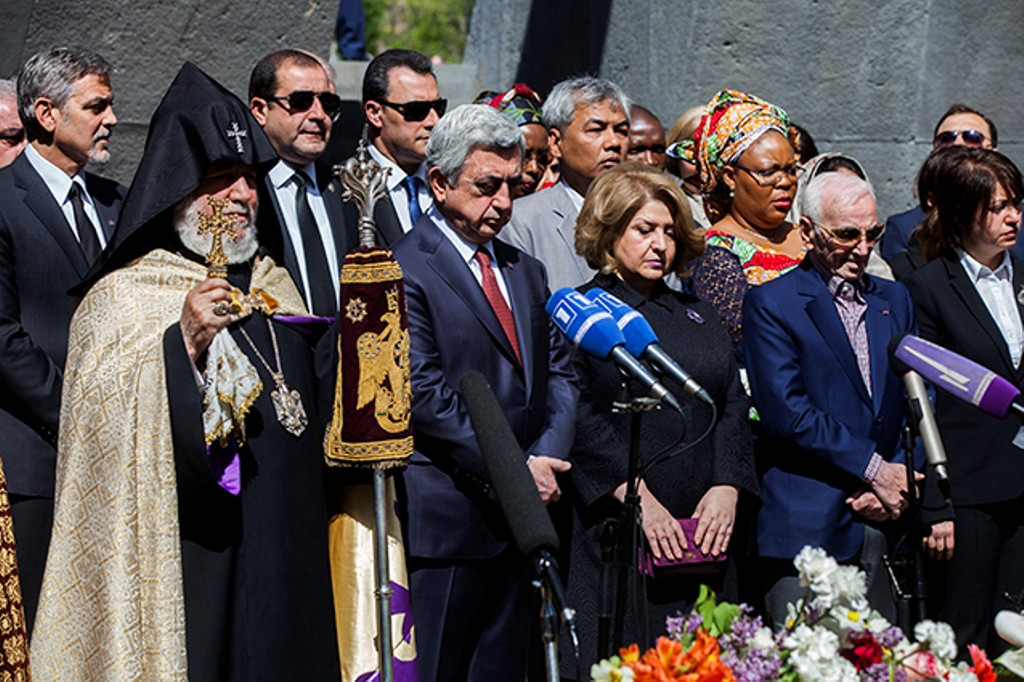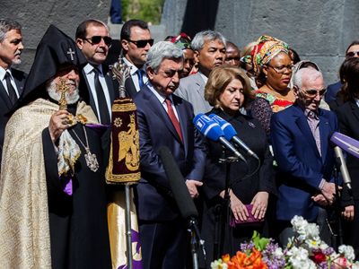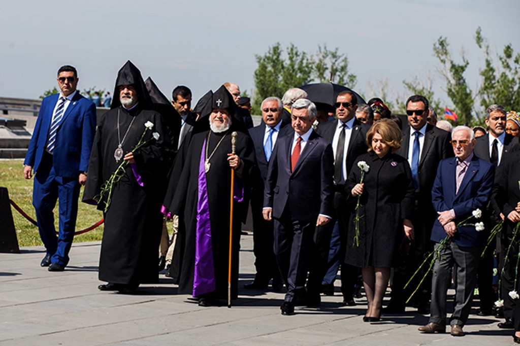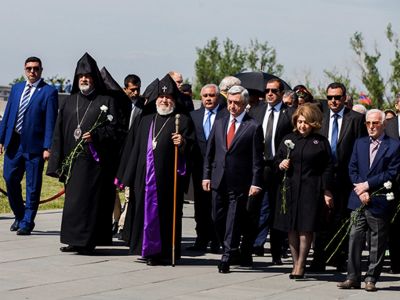 On the morning of April 24, His Holiness Karekin II, Supreme Patriarch and Catholicos of All Armenians; accompanied by members of the Brotherhood of Holy Etchmiadzin, visited the Tsitsernakaberd Memorial Complex, where under the presidency of His Holiness and with the attendance of the RA President Mr. Serzh Sargsyan, a prayer service was held, through which they asked for the intercession of the Holy Martyrs of the Armenian Genocide.