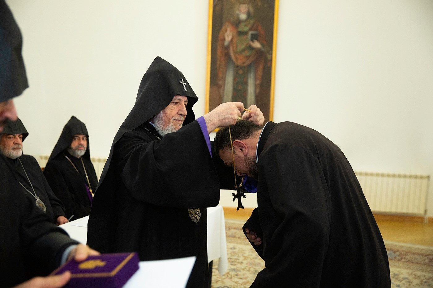 Rev. Fr. Vachagan Gyurjyan and Rev. Fr. Movses Sahakyan serving in the structures of the Mother See of Holy Etchmiadzin; Rev. Harutyun Hakobyan from the Diocese of Msyatsotn; Rev. Fr. Narek Ayvazyan from the Diocese of Gegharkunik; Rev. Fr. Abgar Karapetyan from the Diocese of Tavoush; Rev. Fr. Ghevond Tazyan and Rev. Fr. Hovsep Harutyunyan from the Armenian Diocese of Georgia; Rev. Fr. Haykazun Sahakyan from the Armenian Diocese of Russia and New Nakhichevan were granted the right to wear the Pectoral Cross.