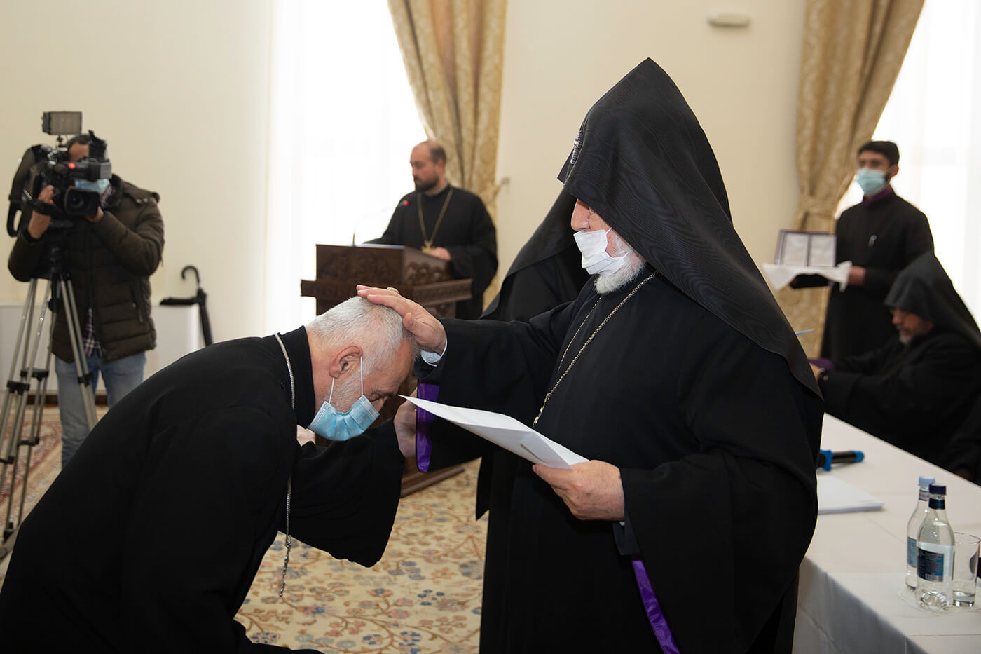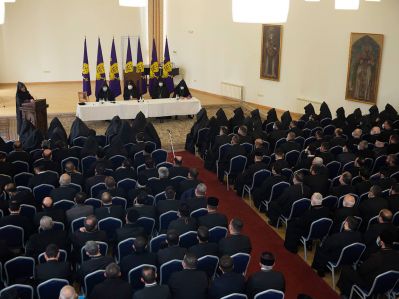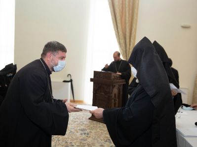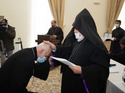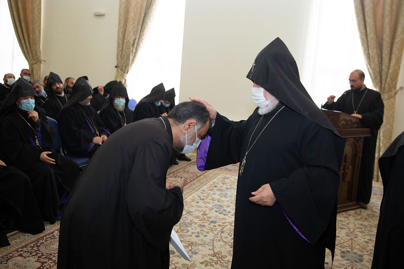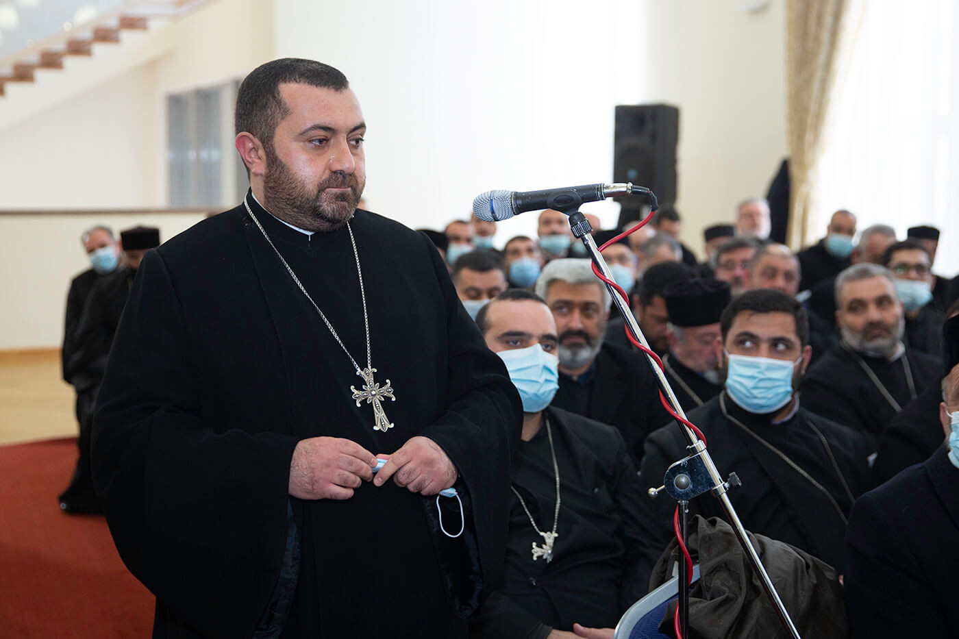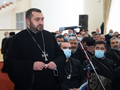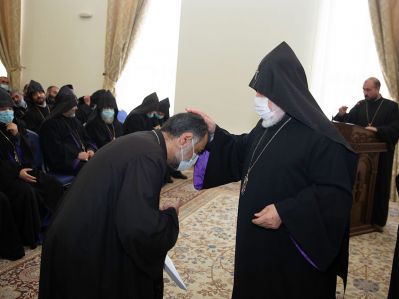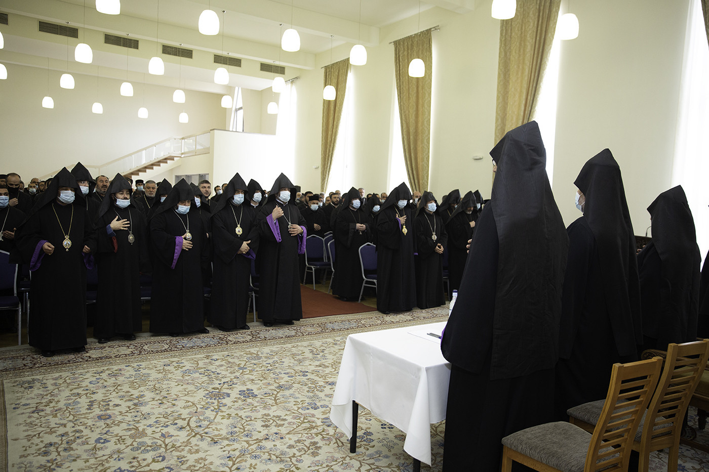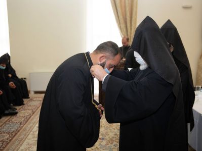On February 09, the Armenian Apostolic Holy Church celebrated the Feast of St. Ghevond the Priest. On this occasion, 230 clergymen gathered in the Mother See of Holy Etchmiadzin, including 13 Diocesan Primates, 29 members of the Brotherhood of the Mother See: bishops, archimandrites and celibate priests; as well as 188 priests from the dioceses of Armenia and Artsakh. On the occasion of the feast, under the presidency of His Holiness Karekin II, Supreme Patriarch and Catholicos of All Armenians; the Divine Liturgy was celebrated at the Holy Mother of God Church of Vagharshapat. The celebrant was Rev. Fr. Khoren Maruqyan, spiritual pastor of the Holy Martyrs Church of Davitashen, Yerevan. ''Being in united and general prayer during the Divine Liturgy, we experience special and unique feelings, because we have the opportunity to renew priestly covenant of our spiritual service, to appreciate more the deep feelings and virtues of living with the meaning of "for the sake of faith'' and ''for the sake of the homeland" coming from the depths of the centuries’’- emphasized Fr. Khoren in his sermon, expressing his gratitude to His Holiness for the opportunity to be again under the hospitable warmth of Holy Etchmiadzin. Reflecting on the sacrament of the day, Rev. Fr. particularly mentioned: “There are dates in history for nations, the commemoration and celebration of which ignite fires in the hearts of the people. Such is the heroic battle of Ghevondyants and Vardanants in 451 in the history of our people. …the commemoration of the heroic battle of Ghevondyants and Vardanants is the story of our high consciousness of national dignity, patriotism, love toward God, martyrdom and existence. Today is the best day for every Armenian to renew his covenant to maintain the homeland, the Church, the language and rich culture. ''…The heroic battle of Ghevondyants and Vardanants is not just an epical episode, but a force that lives, inspires, organizes for centuries, a spirit, a pillar of fire always burning in the Armenian sky, which has guided our people troughout its history. That is why we exist today.” Reflecting on the heroic battle of our days, the Rev. Fr. Emphasized: “We had martyrs in the last war and we bow down before the spirit of their martyrdom. All of them were martyred with the heroic spirit of Ghondiants and Vardanants due to the conscious death toward homeland. No matter how bitter the outcome of the war was for us, we have no right to despair. Just as the price of the blood shed by the martyrs of Gondyants և Vardanants was the perpetuation of our existence, so the price of the sacrifice of the victims of the Artsakh war the guarantee of not committing genocide for the second time. On the occasion of the feast, Rev. Fr. brought his congratulations those present, granting “May God grant us all wisdom, strength and ability to guide our people according to the commandments of the Gospel by renewing the priestly covenant of spiritual service through our zealous, dedicated service and special warmth, to get rid of the hatred of disunity, intolerance, opposition and hatred, the traits that do not appreciate and do not value the role and significance of the Church, the phenomena that live in obsession and perversion, the penitent who does not seek care for salvation among us. The heroic spirit of Ghevondyants and Vardanats let be a weapon for us, so that we can restore and establish historical justice and the dreams of the martyrs of the homeland.” Following the Divine Liturgy, at the Events Auditorium of the Gevorkian Theological Seminary an awards ceremony was held for the priests serving in the Dioceses and Armenian Church institutions. His Eminence Archbishop Mikael Ajapahyan; Primate of the Diocese of Shirak, welcomed the clergy in commemorating the Feast of St. Ghevond the Priest. Following opening remarks, the awards ceremony was held. In appreciation of their long-term devoted and productive pastoral service to the Armenian Church, a number of clergymen were awarded the honor of Archpriest, as well as the right to wear the flowered copea and Pectoral Cross. Rev. Fr. Khoren Kirakosyan; Rev. Fr. Paruyr Avetisyan; Rev. Fr. Vahram Melikyan; Rev. Fr. Adam Makaryan (Mother See of Holy Etchmiadzin) and Rev. Fr. Tirayr Glchyan from the Armenian Diocese of France were elevated to the rank of Archpriest, for their long-term and dedicated pastoral service to the Armenian Church. Rev. Fr. Babken Hayrapetyan; Rev. Fr. Grigor Grigoryan; Rev. Fr. Tovma Andreasyan; Rev. Fr. Shmavon Ghevondyan; Rev. Fr. Zgon Abrahamyan; Rev. Fr. Vahan Araqelyan and Rev. Fr. Ararat Ordoyan from the Araratian Pontifical Diocese; Rev. Fr. Simeon Araqelyan and Rev. Fr. Torgom Margaryan from the Diocese of Tavoush; Rev. Fr. Haykaz Masoyan from the Diocese of Kotayk; Rev. Fr. Nshan Sargsyan from the Diocese of Gegharkunik; Rev. Fr. Sepouh Harutyunayan from the Diocese of Vayots Dzor; Rev. Fr. Tiratur Sardaryan from the Armenian Diocese in Germany; Rev. Fr. Psak Mkrtchyan; Rev. Fr. Hakob Grigoryan and Rev. Fr. Galust Sahakyan from the RA Army Chaplaincy were granted the honor to wear the ornamented cope. Rev. Fr. Varazdat Najaryan and Rev. Fr. Gyut Galstyan from the RA Army Chaplaincy; Rev. Fr. Makar Galamdaryan and Rev. Fr. Narek Antonyan from the Diocese of Shirak; Rev. Fr. Hamazasp Hageyan from the Diocese of Kotayk; Rev. Fr. Simeon Hovhannisyan from the Diocese of Gegharkunik; Rev. Fr. Levon Davtyan and Rev. Fr. Vagharsh Hakobyan from the Diocese of Gougark; Rev. Fr. Gevorg Abyan and Rev. Fr. Artashes Hakobyan from the Diocese of Masyatsotn; Rev. Fr. Beniamin Tsaturyan from the Diocese of Artsakh; Rev. Fr. Ashot Abrahamyan from the Saint Gregory the Illuminator Mother Cathedral of Yerevan; were granted the right to bear pectoral crosses. At the end of the Award Ceremony, the Catholicos of All Armenians conveyed His Blessings and Pontifical message to the clergy. Warmly congratulating the clergy on the oc