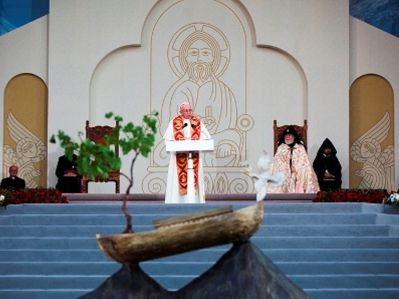 Having in our hearts the spiritual joy of our meeting, which is grated to us by our benevolent God, we beseech our Lord and Savior for His grace and peace for us all, and invite You, Our beloved Brother in Christ, to deliver Your message and convey Your abundant blessings to the thousands of faithful gathered here.