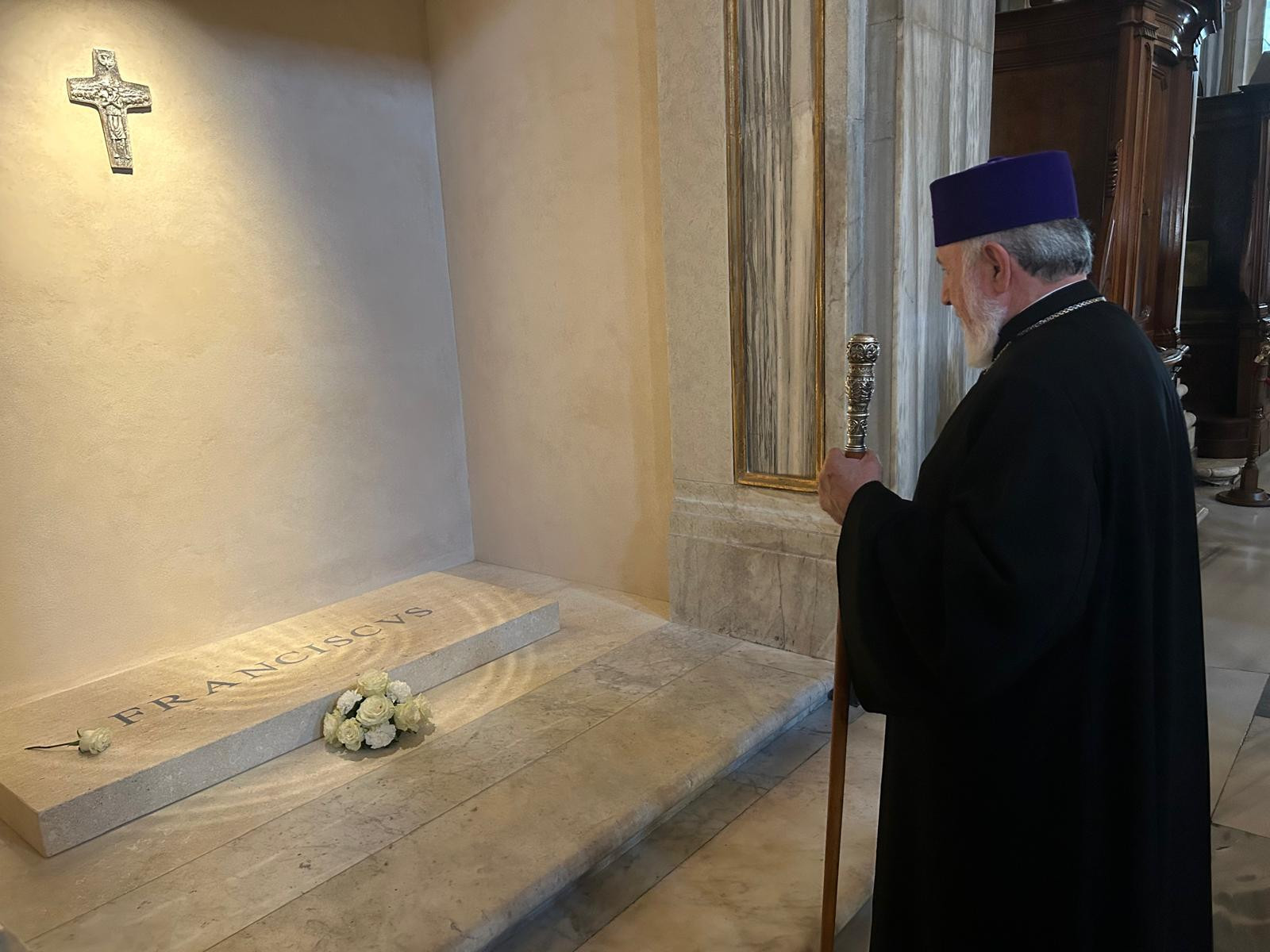 As part of his visit to the Vatican, the Catholicos visited the Basilica of Saint Mary in Rome, where he prayed at the tomb of the late Pope Francis for the repose of his soul.