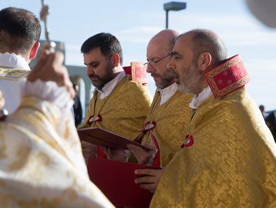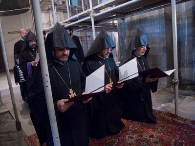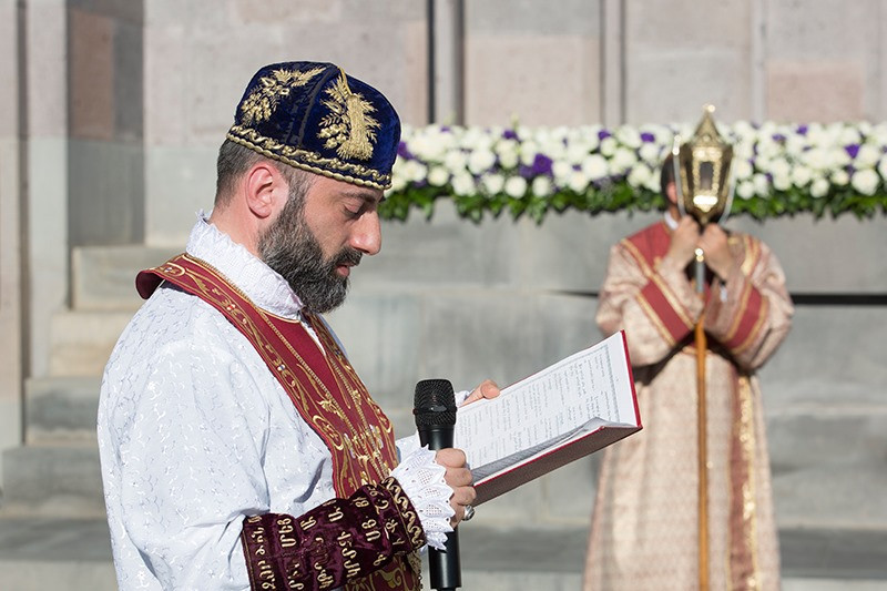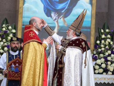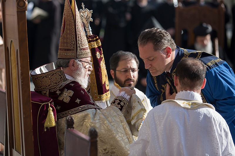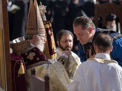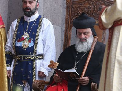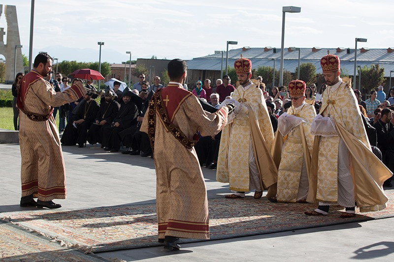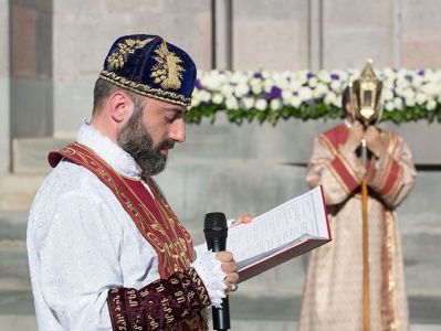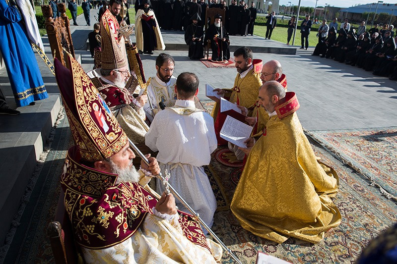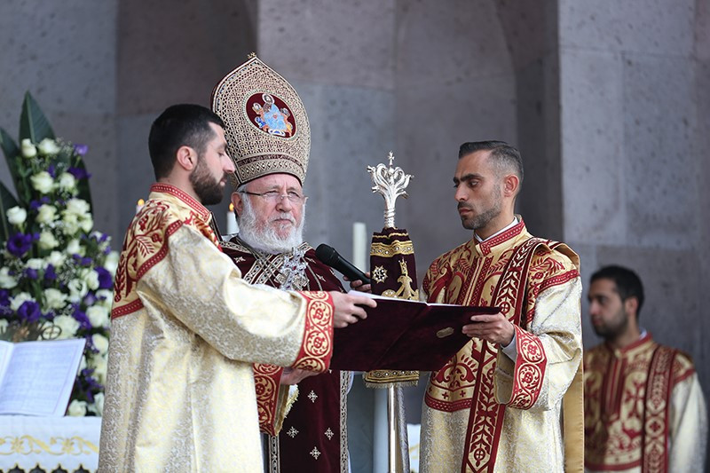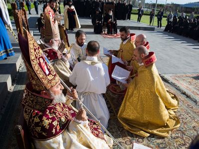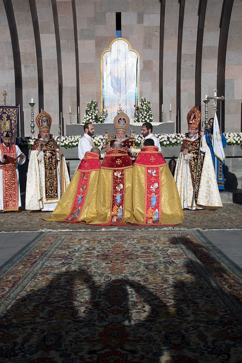 Assisting His Holiness were His Eminence Archbishop Khajak Parsamyan, Pontifical Delegate of Western Europe and His Grace Bishop Artak Tigranyan, Dean of the Monasteries of the Mother See of Holy Etchmiadzin; His Grace Bishop Armash Nalbandyan, Primate of the Armenian Diocese of Damascus, testified for the spiritual and religious training and virtues of the candidates. The choir of the Mother Cathedral was headed by Mr. Khoren Mekhanehyan.