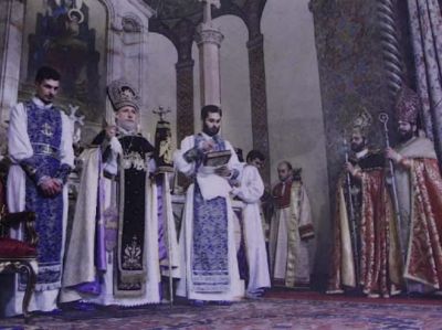 The Pontifical procession entered the cathedral under the singing of the "Hrashapar" hymn. In the northern apse of the cathedral, before the Altar of St. Stephen, His Holiness conducted the public examination of the worthiness of the two priests, during which their profession of the faith, as well as the renunciation of the heretics, was fulfilled. The Altar of St. Stephen is the traditional location in the Mother Cathedral where the episcopal consecration service begins.