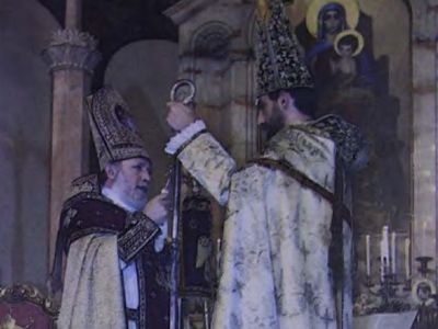 The Divine Liturgy then continued before the Main Altar of the Mother Cathedral. Reciting prayers from the ?Mashtots? (ritual book) of ordination, His Holiness called the candidate to the rank of bishop. The Supreme Patriarch consecrated the candidate?s forehead and the thumb of the right hand with Holy Chrism, following which the symbols of episcopacy ? the episcopal staff and ring, were presented to the newly consecrated bishop.