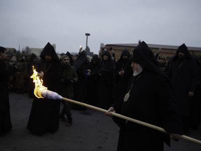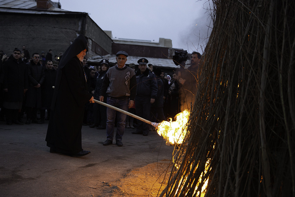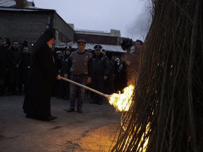At the conclusion of the Service, under the delightful "Christ in Glory" hym, a candle was lit by His Holiness from the Holy Altar of St. Gayane Monastery, symbolizing Christ. Then His Holiness Karekin II, Supreme Patriarch and Catholicos of All Armenians; lit a traditional bonfire at the courtyard of the Monastic residence, conveying the light to the faithful who were present.