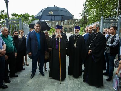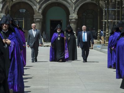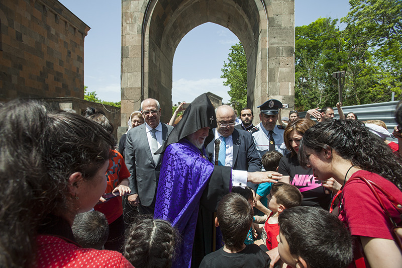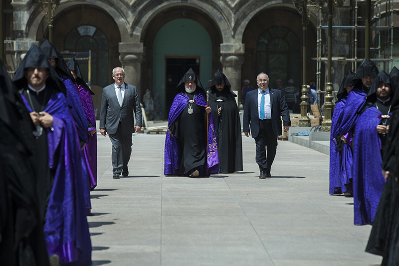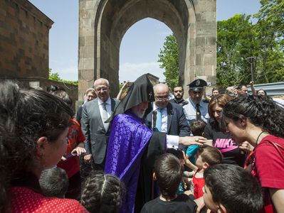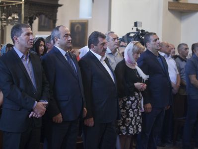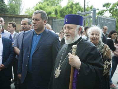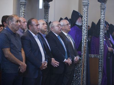 On May 29, the Armenian Apostolic Holy Church solemnly celebrated the Feast of the Universal Holy Church of Etchmiadzin. Under the presidency of His Holiness Karekin II, Supreme Patriarch and Catholicos of All Armenians; Divine Liturgy was offered in the Mother Cathedral. Primates of the Armenian Dioceses; Bishops of the various institutions of the Armenian Church; members of the Brotherhood of the Mother See; clergy of the Diocese of Tavush and the region’s pilgrims, led by Mr. Hovik Abovyan, the Tavush governor and community leaders; as well as servicemen and numerous faithful citizens, gathered in the Mother See of Holy Etchmiadzin on the occasion of the feast. Attending the Divine Liturgy were benefactors of the Mother See: Mr. Berge Setrakian, AGBU President; Mr. Gabriel Chemberchyan, Founding President of the "Pyunik" Charitable Foundation; and Mr. Vasken Yakubyan, AGBU Central Board member responsible for projects in the Middle East and Armenia.