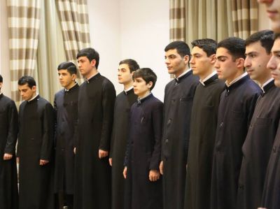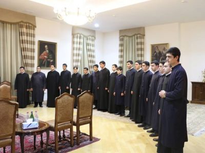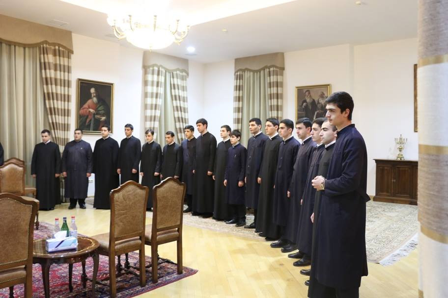 Prior to their departure, on the evening of February 4, the "Etchmiadzin" choir students, accompanied by His Grace Bishop Gevork Saroyan, Dean of the Spiritual-Educational institutions of Mother See; Rev. Fr. Karekin Hambardzumyan; Dean of the Gevorkian Theological Seminary and Dn. Artur Vardanyan, Founder and Director of the Choir, were received by the Catholicos of All Armenians.