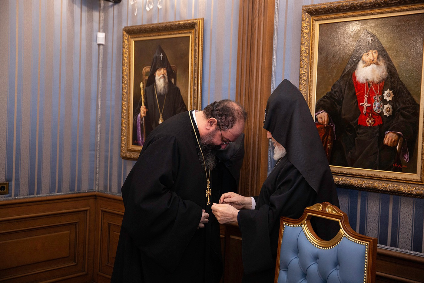 At the conclusion, the Catholicos of All Armenians decorated the chest of Archimandrite Poghos with a pectoral cross and blessed him with the "Protector" prayer.