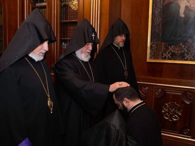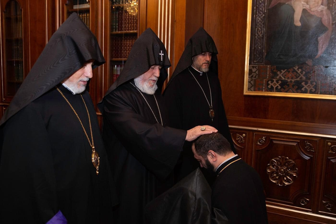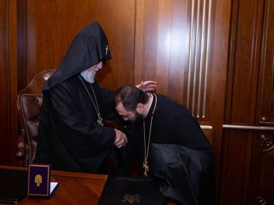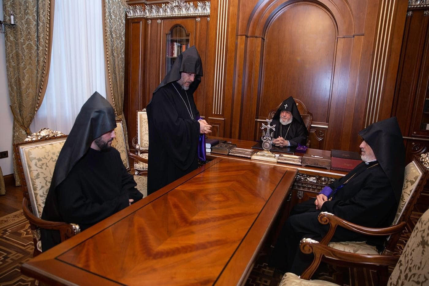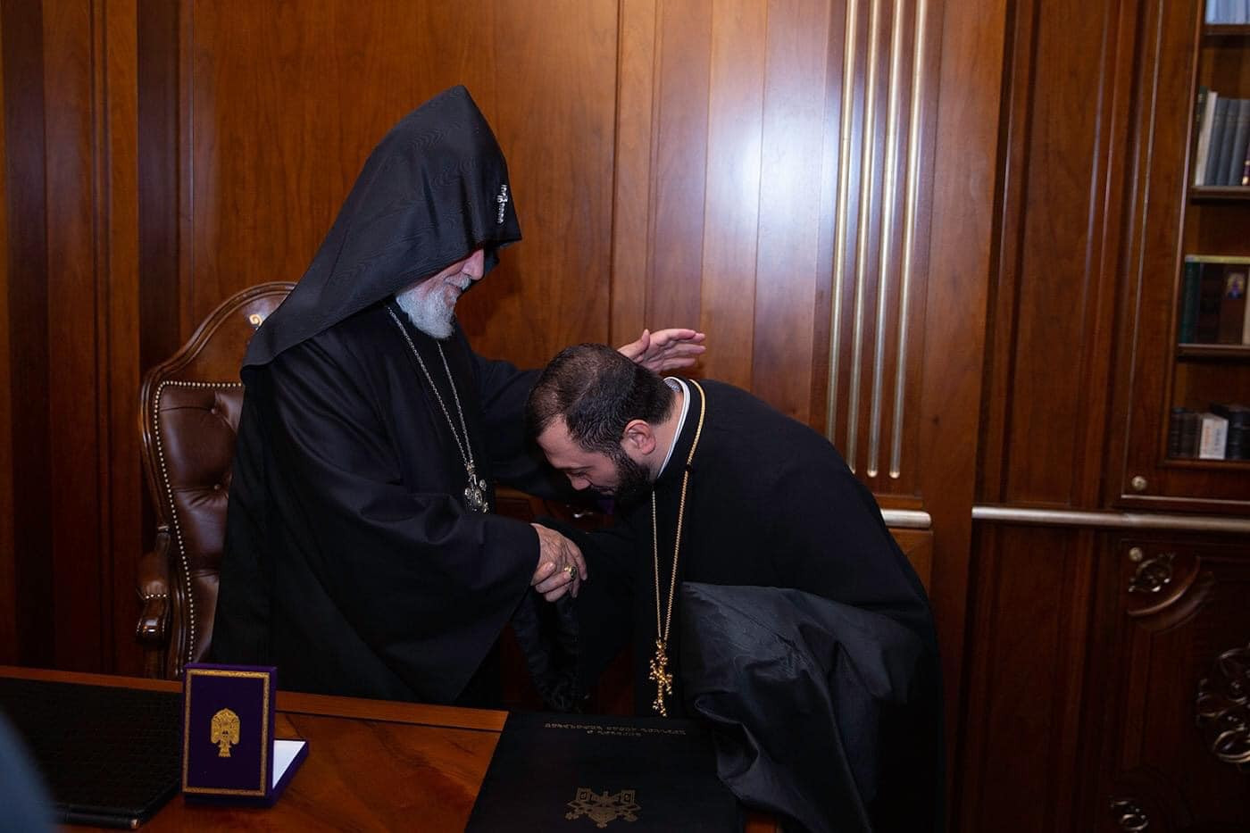 On the same day, the Catholicos of All Armenians received the newly ordained Archimandrite. At the meeting, the Grand Sacristan of the Mother See, His Grace Bishop Moushegh Babayan, asking for the Pontifical blessings of His Holiness, presented the Archimandrite who was awarded the doctrinal rank.