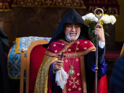 At the conclusion, the Catholicos of All Armenians decorated the chest of Archimandrite Poghos with a pectoral cross and blessed him with the "Protector" prayer.