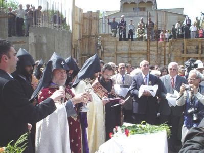 Accompanying His Holiness for the blessing service were His Grace Bishop Navasard Ktchoyan, Vicar General of Araratian Pontifical Diocese; His Grace Bishop Arakel Karamian, Primate of the Diocese of Kotayk; His Grace Bishop Movses Movsissian, Primate of the Armenian Church Diocese of Southern Russia; His Grace Bishop Vazgen Mirzakhanian, Primate of the Armenian Church Diocese of Georgia; His Grace Bishop Bagrat Galsdanian, Primate of the Canadian Diocese of the Armenian Church; Mr. and Mrs. Sarkis Bedevian, benefactors of the Cathedral of Saint Gregory of Narek; Mr. and Mrs. Karnig Yacoubian, benefactors of the Vaskenian Seminary of Lake Sevan; Deacon Varoujan Altebarmakian, Diocesan Council Chairman for the Western Diocese of the Armenian Church of North America; and Mr. Jack Stepanian, Diocesan Council Chairman for the Canadian Diocese of the Armenian Church.