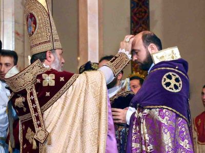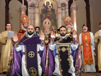 On January 15, episcopal ordinations for two new bishops of the Armenian Church were conducted in the Mother See of Holy Etchmiadzin. His Holiness Karekin II, Supreme Patriarch and Catholicos of All Armenians celebrated a Pontifical Divine Liturgy and thereupon consecrated, ordained and elevated Very Rev. Fr. Ashot Mnatsakanian, Primate of the Armenian Diocese of Egypt and Very Rev. Fr. Armash Nalbandian, Primate of the Armenian Diocese of Damascus to the rank of bishop. The bishops were ordained to continue their service as primates of Armenian communities in the Middle East.