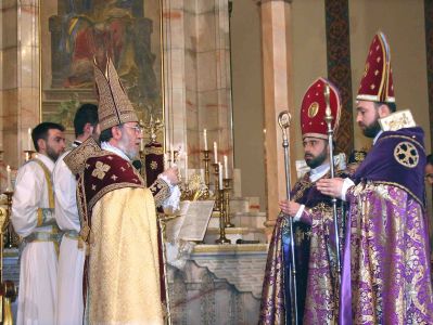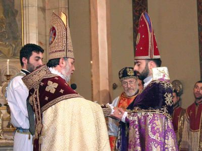 The previous evening, the two candidates kneeled before the Holy Altar of Descent in the Mother Cathedral, vowed to remain faithful to the Holy Gospel, to the canons of the Holy Armenian Apostolic Church and to the Mother See of Holy Etchmiadzin, and signed their oaths.