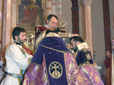 The Divine Liturgy then continued before the Main Altar of the Mother Cathedral. Reciting prayers from the "Mashtots" (ritual book) of ordination, His Holiness called the candidates to the rank of bishop. The Supreme Patriarch consecrated the candidates' foreheads and the thumbs of their right hand with Holy Chrism, following which the symbols of episcopacy - the episcopal staff and ring, were presented to the newly consecrated bishops.