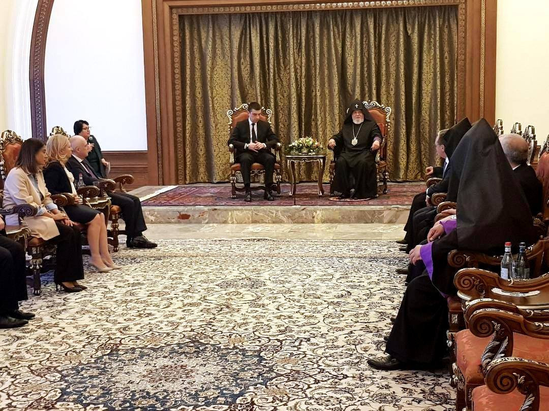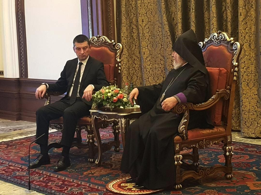 Welcoming the visit of the Delegation led by the Prime Minister of Georgia to the Spiritual center of All Armenians, the Pontiff of All Armenians congratulated Mr. Giorgi Gakharia for assuming the responsible role of the Georgian Prime Minister and expressed hope that the visit will contribute to the strengthening of the Armenian-Georgian centuries-old friendship. His Holiness reflected on the historical relations between the two nations which are rich with numerous testimonies of mutual help, support and united struggle affirming that those are the solid base on which the two countries' partnerships should be built and established.