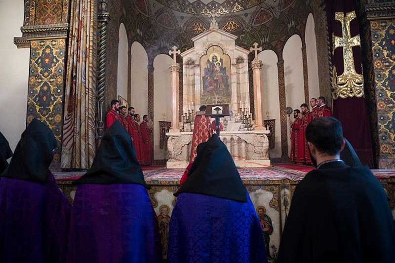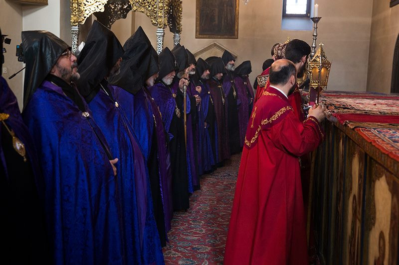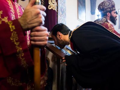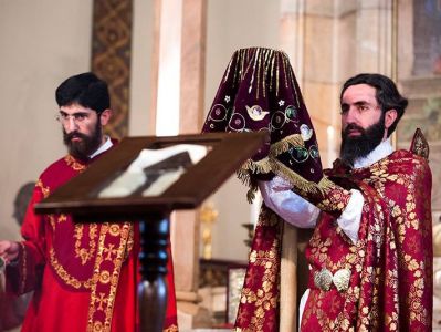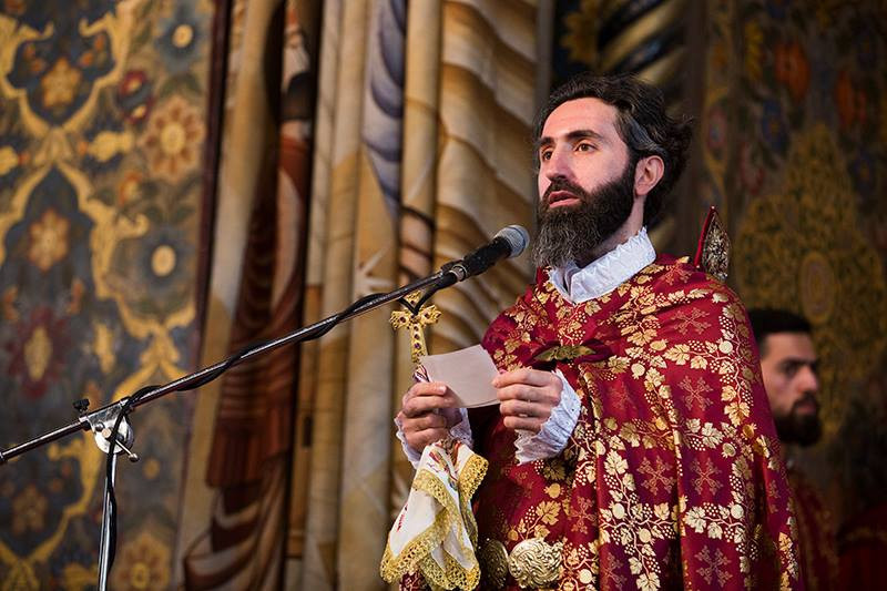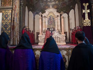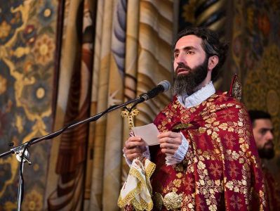 At the conclusion, on the occasion of the feast, Fr. Asoghik, on behalf of the Brotherhood and staff of the Mother See and the faithful, congratulated His Holiness, wishing that God strengthens him in his apostolic calling, so that the Divine graces derived from His Holiness be shed on the clergy and through him to all our people and the world. Fr. Asoghik also congratulated the sacred bishops and clergy of the church, as  spiritual servants to distribute the Divine blessing to the people of Armenia and Diaspora. Addressing his remarks to the pilgrims in attendance, the Celebrant said: “Also, I congratulate you, dear faithful that you through the prophecy and mission of the 12 apostles of Christ, were spiritually born and become God's children, and for centuries you have enjoyed God's blessing. And we believe in the promise of Christ, you will continue to enjoy it until God has come to judge the world for the second time”.