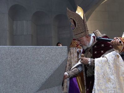 “The initiative to build a pantheon for the interment of Catholicoi was first envisioned in 1955, during the pontificate of the late Catholicos of All Armenians Vazgen I. We rejoice that, though unaware of that earlier vision, we were likewise inspired to undertake the creation of a Catholicosal Mausoleum in Holy Etchmiadzin. Today, this vision has been magnificently realized and will also serve our faithful as a prayer hall for candle lighting.